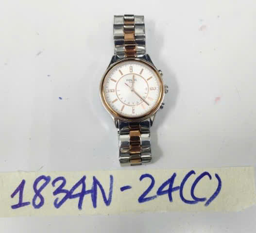 Ngày tiếp nhận: 27/10/2024 Mã hồ sơ: 1834N2024C Mô tả: 01 Đồng hồ mặt tròn, dây KL màu bạc có chữ "Fossil Hybrid". |