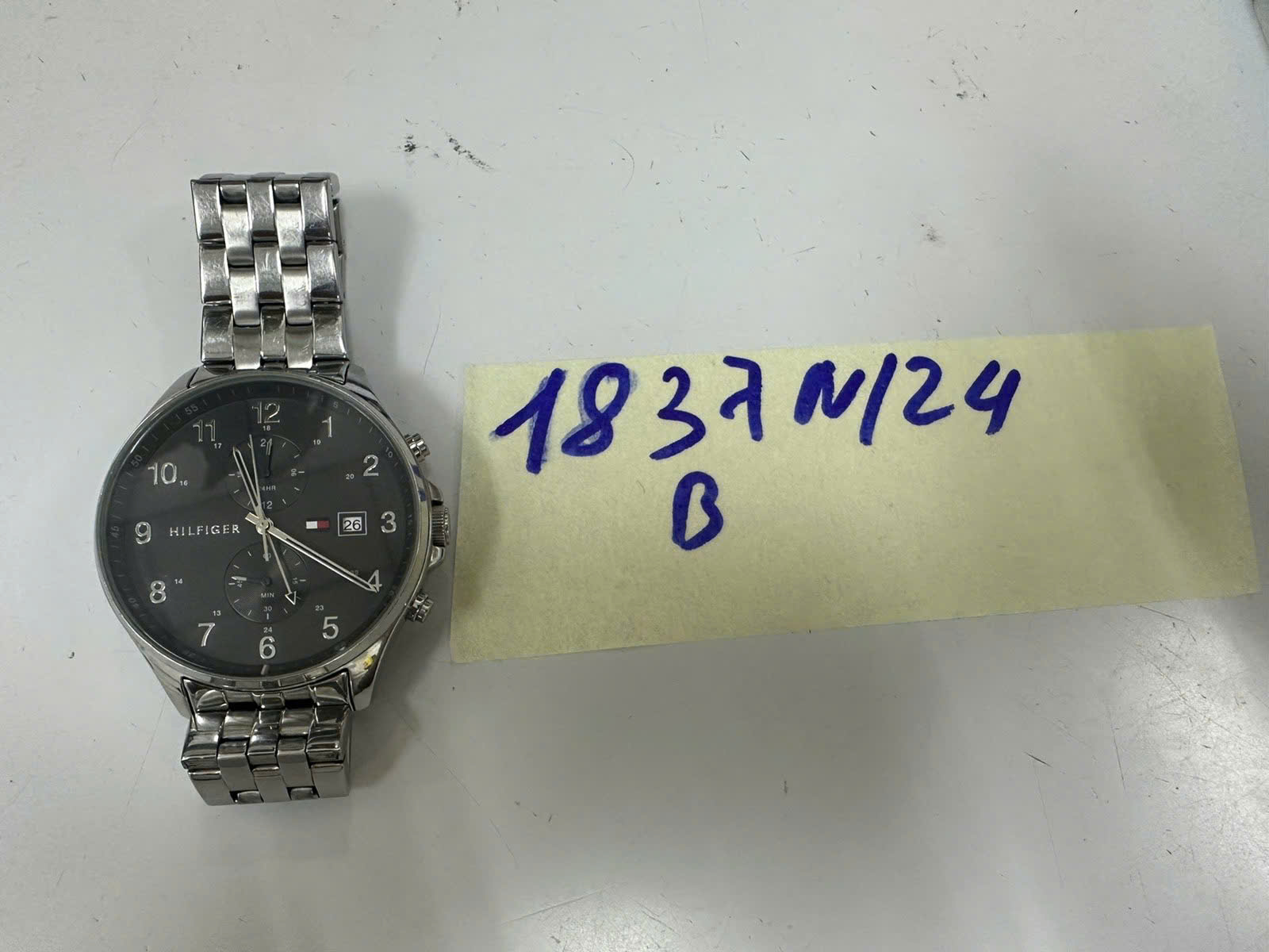Ngày tiếp nhận: 28/10/2024 Mã hồ sơ: 1837N2024B Mô tả: 01 đồng hồ đeo tay bằng kim loại màu bạc, mặt đồng hồ hình tròn có logo chữ "HILFIGER". |