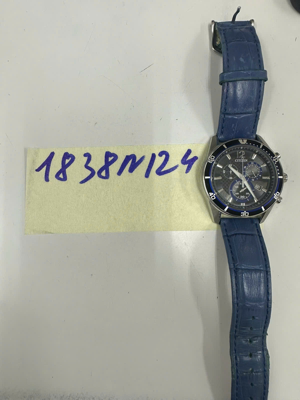 Ngày tiếp nhận: 28/10/2024 Mã hồ sơ: 1838N2024 Mô tả: 01 đồng hồ mắt tròn có chữ "CITIZEN" màu đen/ xanh, mắt đồng hồ màu đen, dây đồng hồ da màu xanh. |