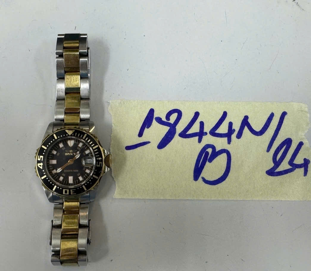 Ngày tiếp nhận: 28/10/2024 Mã hồ sơ: 1844N2024B Mô tả: 01 đồng hồ dây kim loại màu vàng và bạc, có chữ "Invicta". |