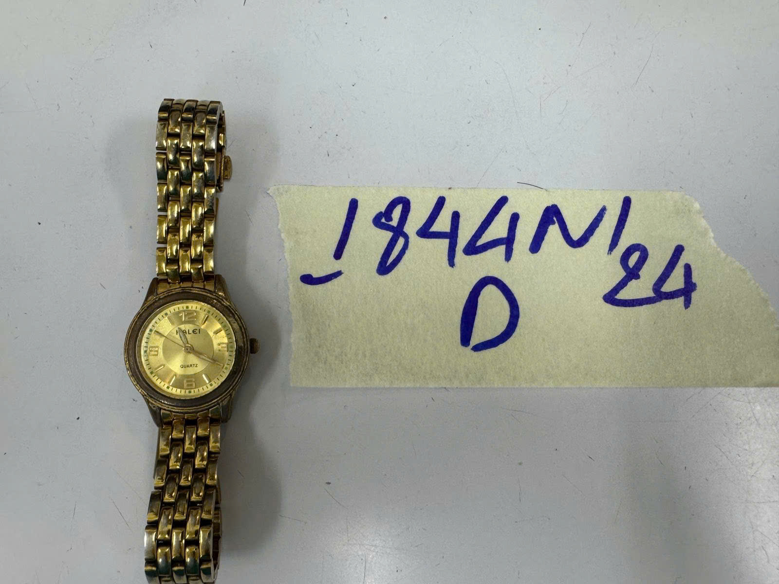 Ngày tiếp nhận: 28/10/2024 Mã hồ sơ: 1844N2024D Mô tả: 01 đồng hồ mặt tròn dây kim loại màu vàng có chữ "HALEI". |