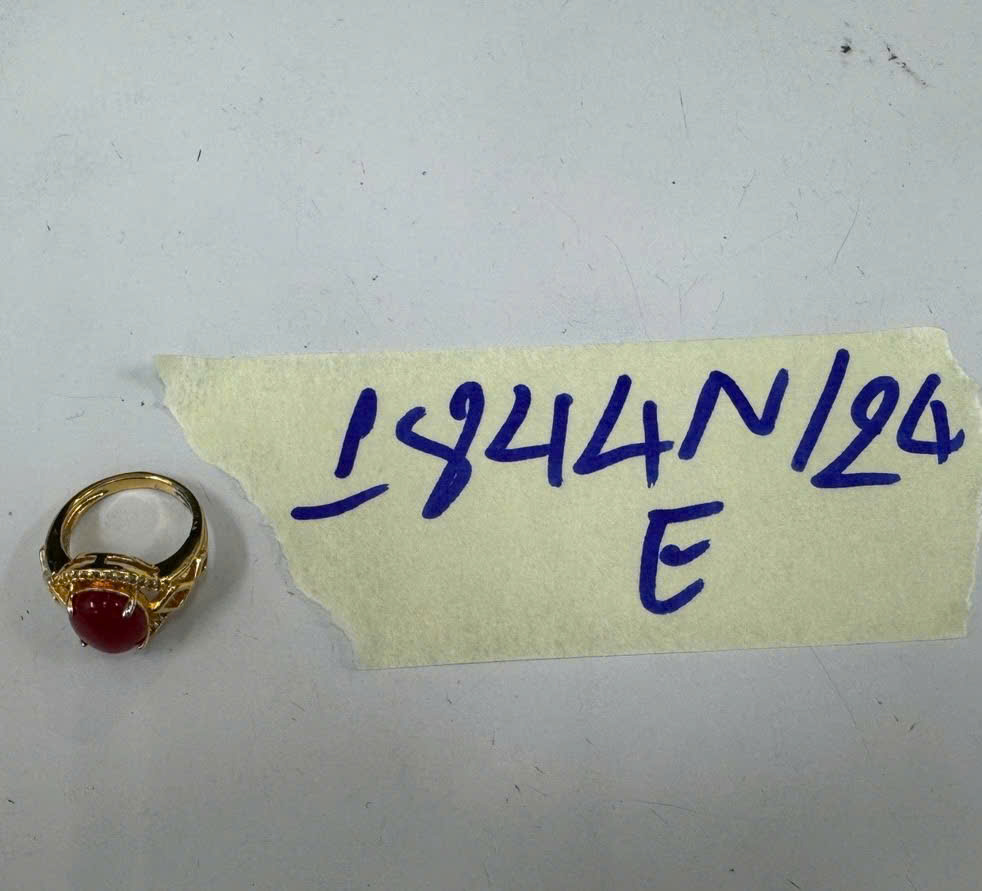 Ngày tiếp nhận: 28/10/2024 Mã hồ sơ: 1844N2024E Mô tả: 01 nhẫn kim loại màu vàng bên trên có đính hạt màu đỏ. |
