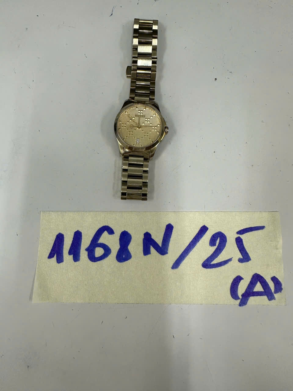 Ngày tiếp nhận: 27/6/2025 Mã hồ sơ: 1168N2025A Mô tả: 01 đồng hồ GUCCI mặt tròn, dây kim loại màu vàng. |