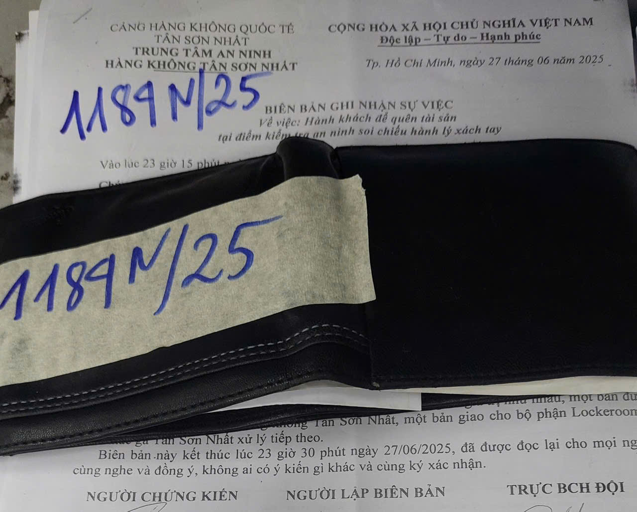 Ngày tiếp nhận: 27/6/2025 Mã hồ sơ: 1168N2025B Mô tả: 01 ví tiền màu đen có chữ LEONARDO bên trong có: 678.000NVD, 8 dollar, giấy tờ và thẻ ngân hàng tên TRAN VU PHUOC SANG, giấy đăng kí xe Vũ Thị Mộng Thùy. |