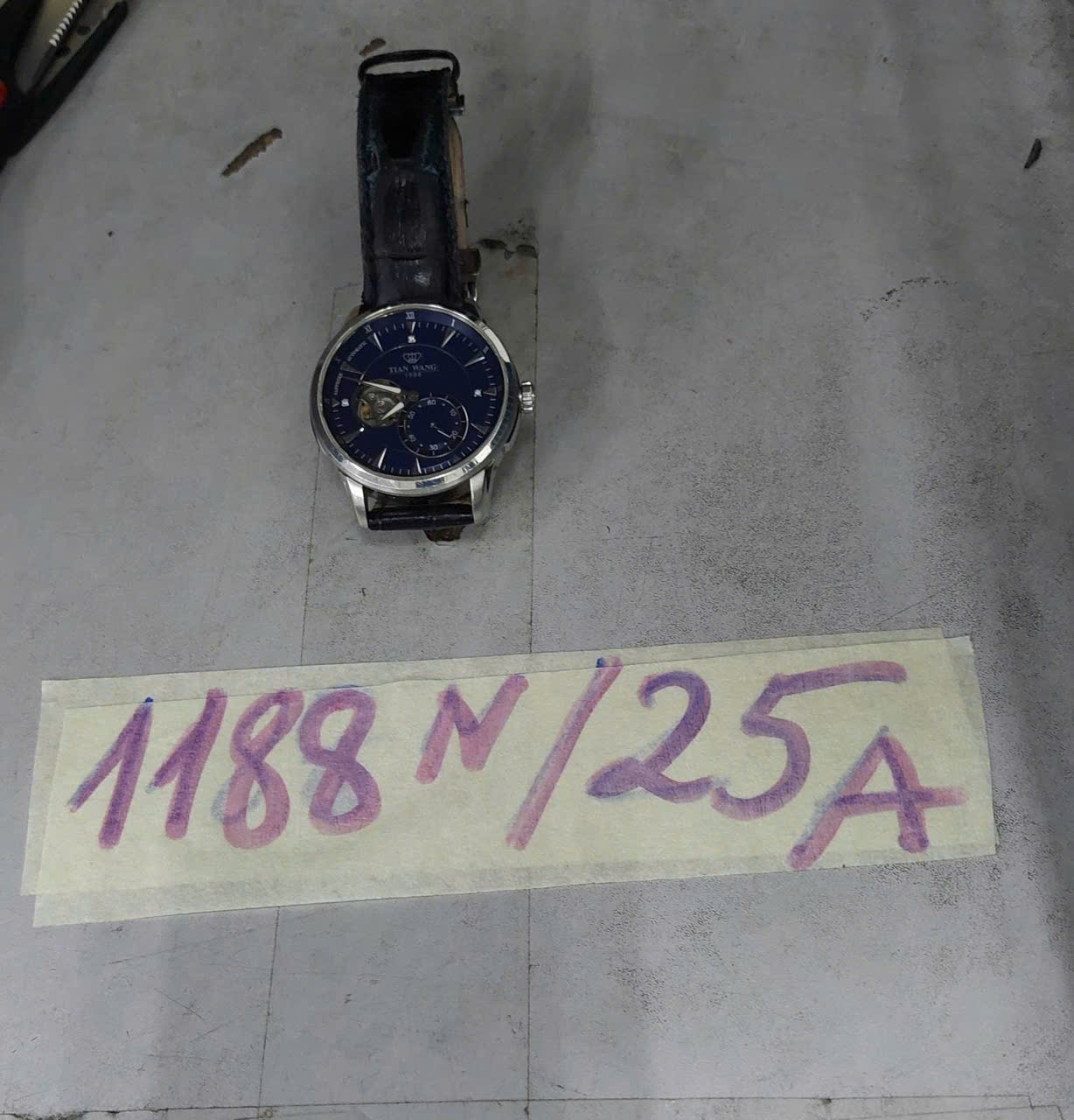 Ngày tiếp nhận: 01/7/2025 Mã hồ sơ: 1188N2025A Mô tả: 01 đồng hồ mặt tròn mặt tròn có mặt trước màu xanh dương, logo chữ TITANWANG, có dây đeo da màu đen. |