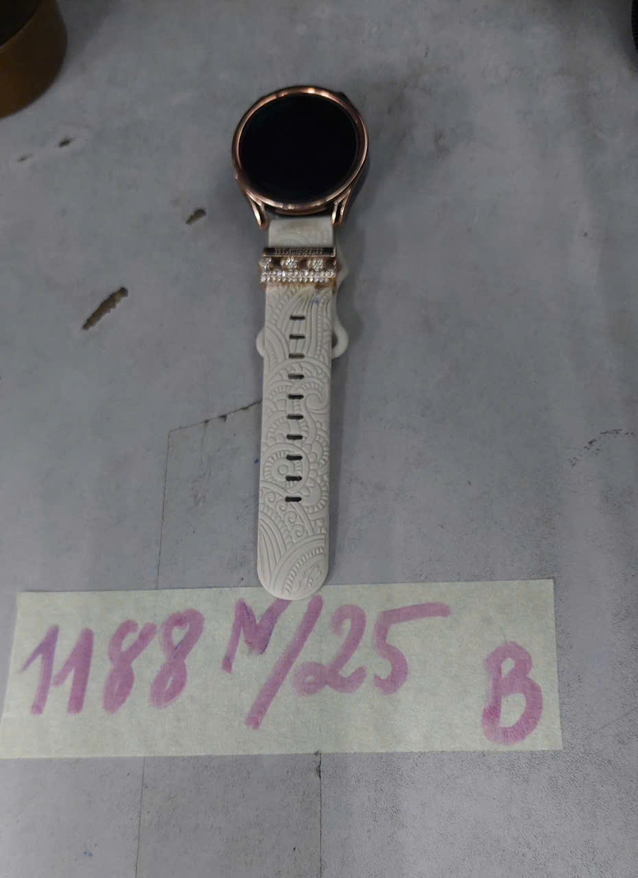 Ngày tiếp nhận: 01/7/2025 Mã hồ sơ: 1188N2025B Mô tả: 01 đồng hồ thông minh SAMSUNG, mặt tròn màu đen vàng, có dây đeo cao su màu trắng khắc họa tiết, logo chữ BLESSED. |