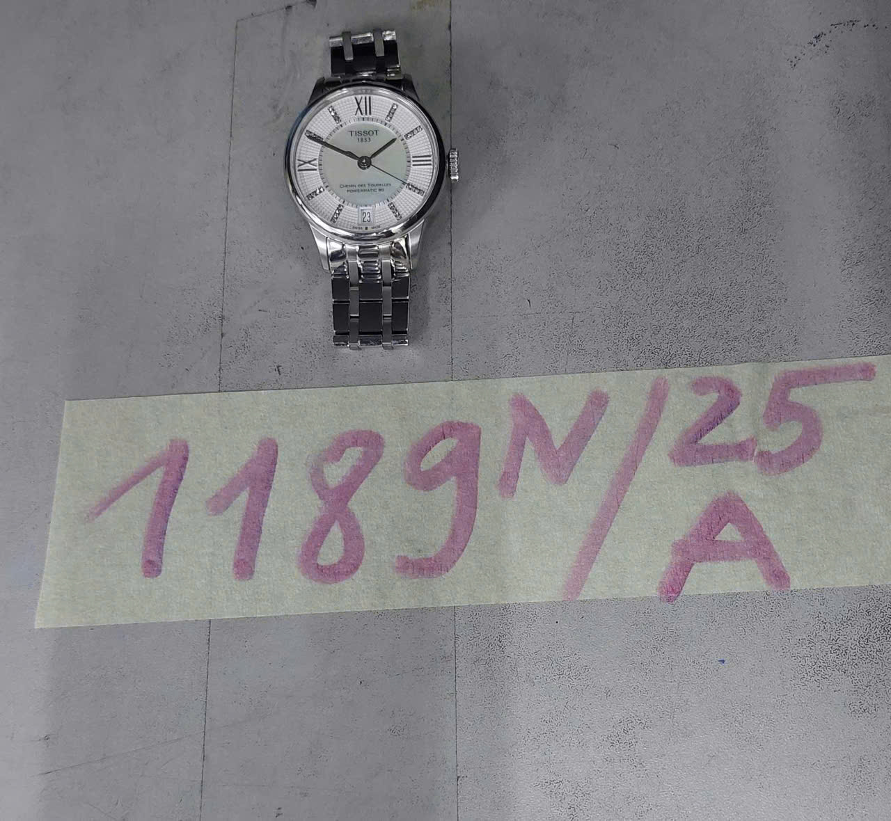 Ngày tiếp nhận: 01/7/2025 Mã hồ sơ: 1189N2025A Mô tả: 01 Đồng hồ đeo tay bằng kim loại màu trắng mặt có chữ TISOT 1853 CHEMIN DES TOURELLES, cọc số đính đá, mặt sau có dãy số 7U2MG4UV7, dây đeo bằng kim loại màu trắng. |