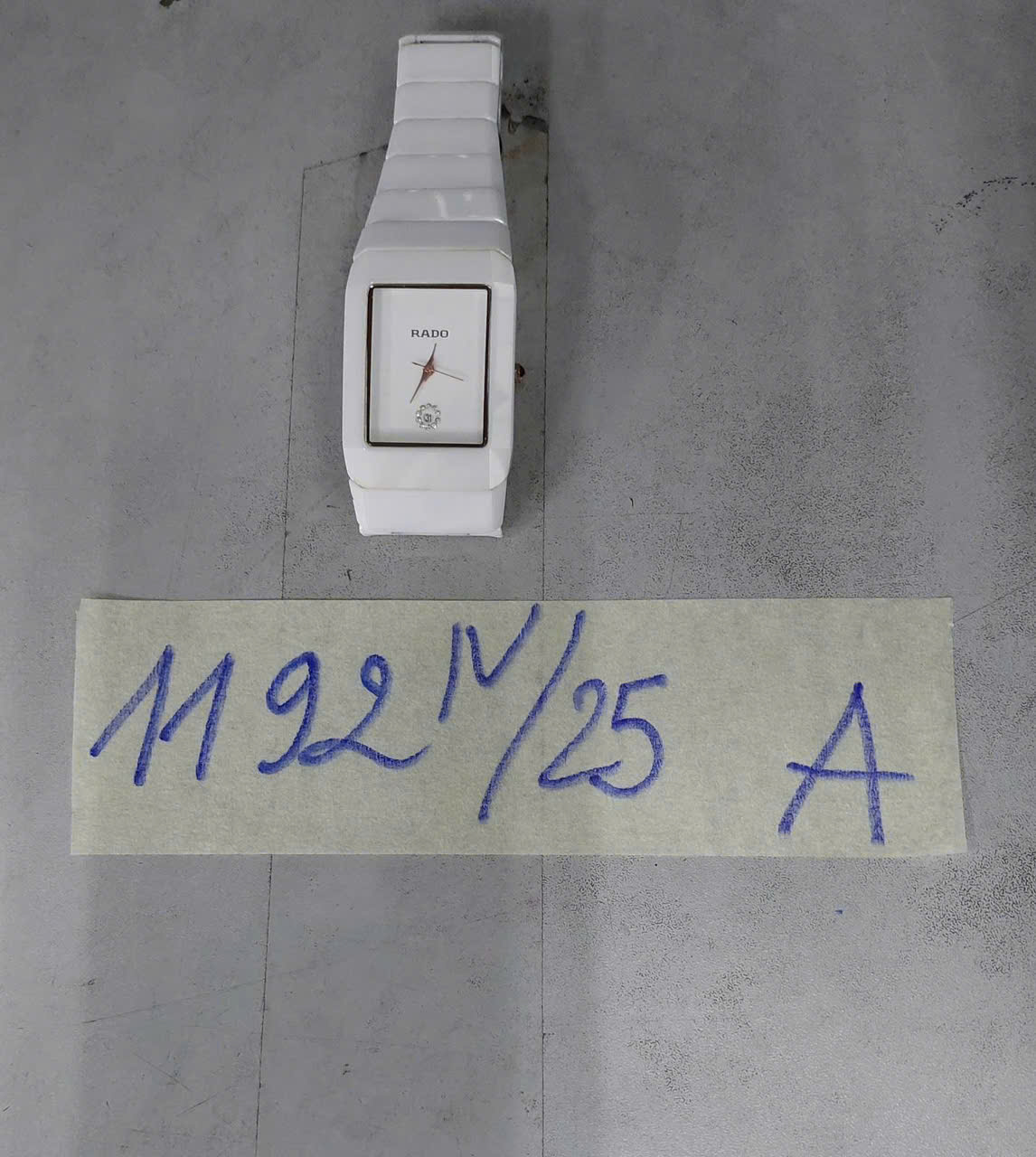 Ngày tiếp nhận: 01/7/2025 Mã hồ sơ: 1192N2025A Mô tả: 01 đồng hồ màu trắng, mặt đồng hồ hình chữ nhật màu trắng, dây đồng hồ màu trắng , khóa đồng hồ bằng kim loại màu bạc, trên mặt và dây đồng hồ có chữ RADO. |