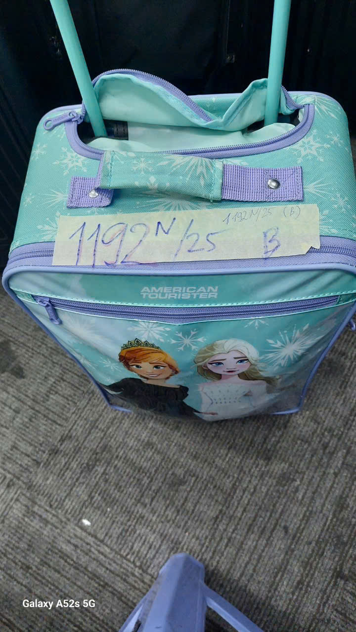 Ngày tiếp nhận: 01/7/2025 Mã hồ sơ: 1192N2025B Mô tả: 01 Vali vải màu xanh ngọc viền tím, bên trong có quần áo trẻ em, đồ chơi lắp ráp, trên vali có chữ AMERICAN TOURIST. |