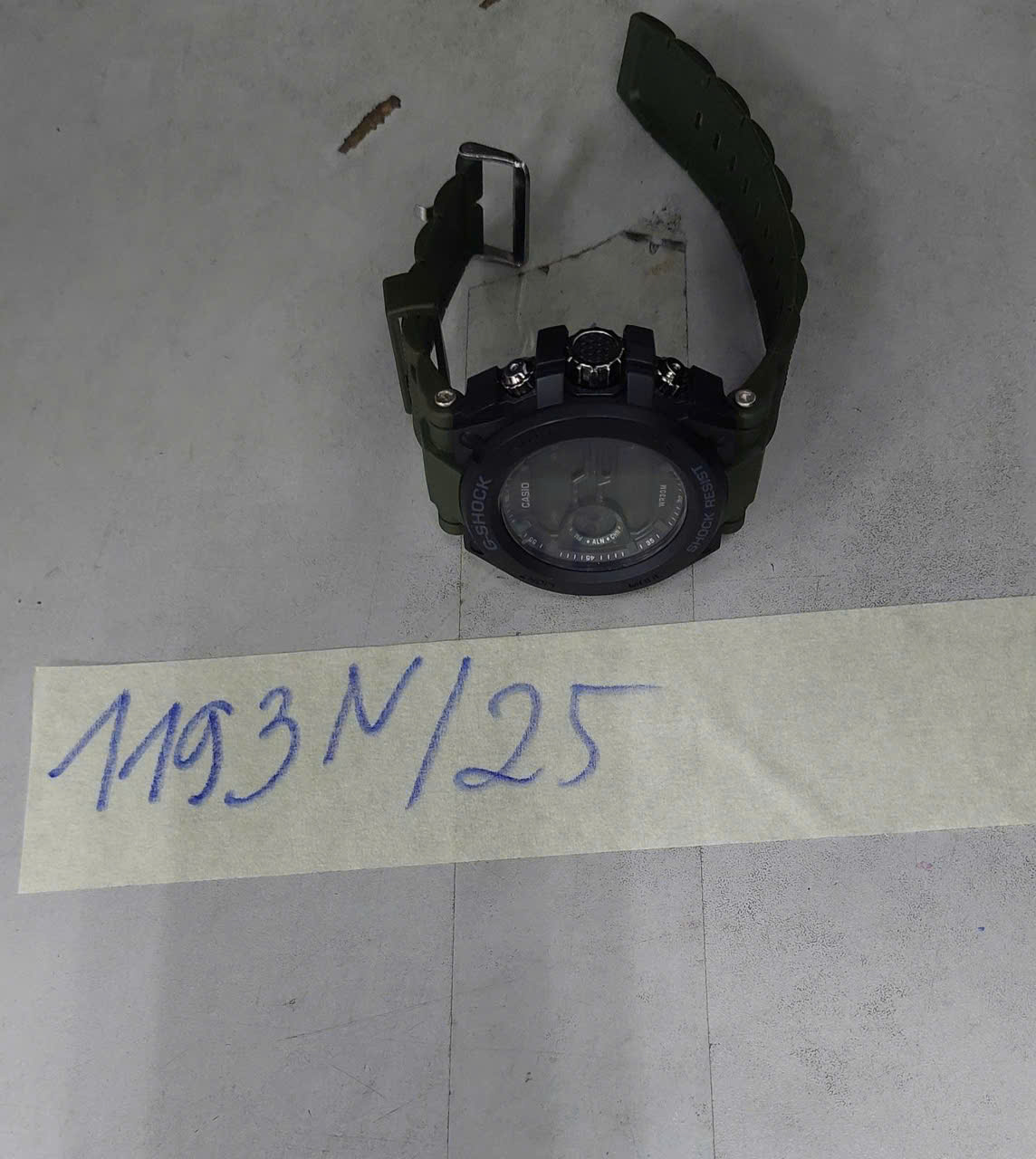 Ngày tiếp nhận: 01/7/2025 Mã hồ sơ: 1193N2025 Mô tả: 01 đồng hồ mặt tròn màu đen có chữ CASIO GSHOCK, dây đeo cao su màu xanh.. |