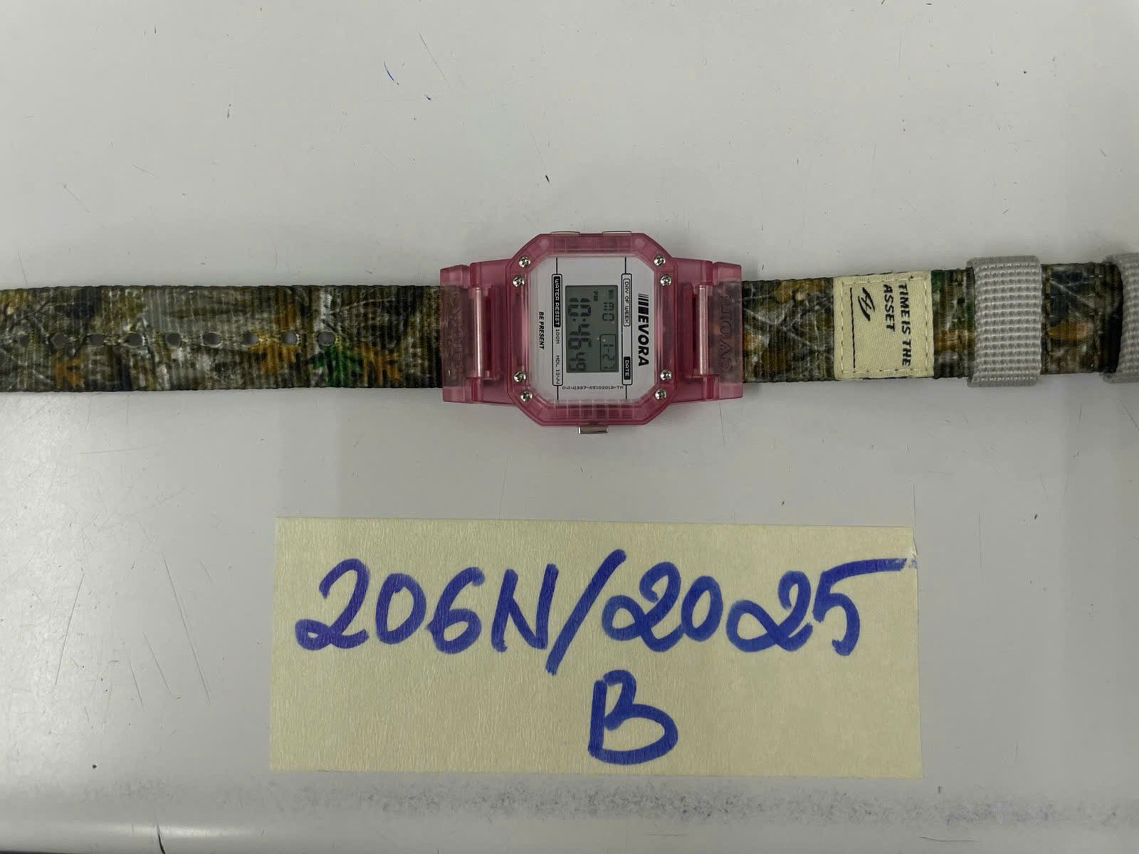 Ngày tiếp nhận: 28/01/2025 Mã hồ sơ: 206N2025B Mô tả: 01 đồng hồ điện tử EVORA, mặt màu hồng, dây nhựa màu xanh lá cây. |