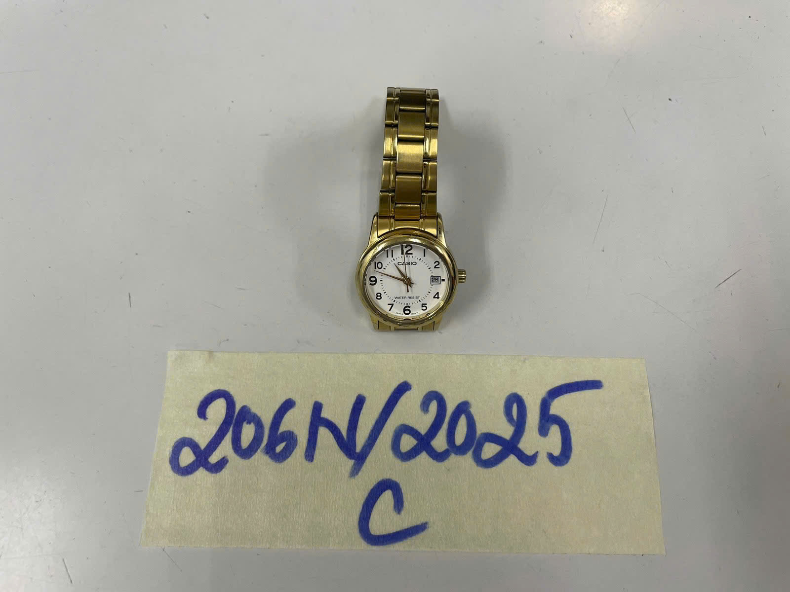 Ngày tiếp nhận: 28/01/2025 Mã hồ sơ: 206N2025C Mô tả: 01 đồng hộ CASIO mặt trắng, dây kim loại màu vàng. |