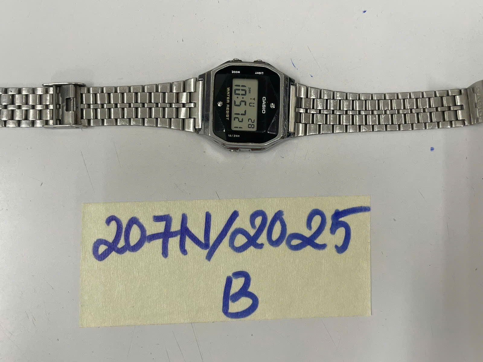 Ngày tiếp nhận: 28/01/2025 Mã hồ sơ: 207N2025B Mô tả: 01 đồng hồ Casio dây đeo kim loại màu bạc. |