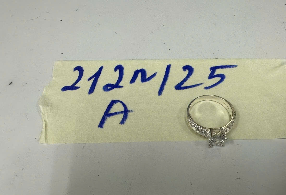 Ngày tiếp nhận: 28/01/2025 Mã hồ sơ: 212N2025A Mô tả: 01 nhẫn kim loại màu trắng mặt có đính đá. |