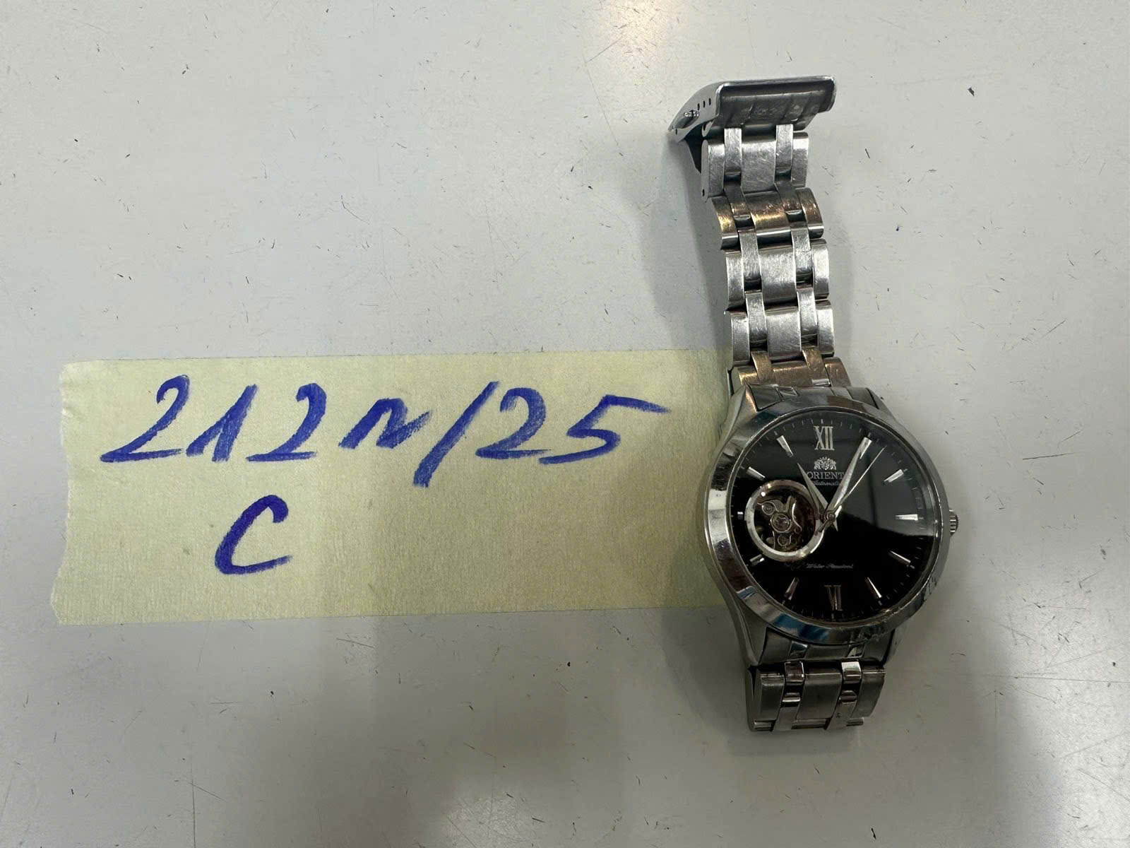 Ngày tiếp nhận: 28/01/2025 Mã hồ sơ: 212N2025C Mô tả: 01 đồng hồ kim loại mặt màu đen có chữ "Orient automatic". |