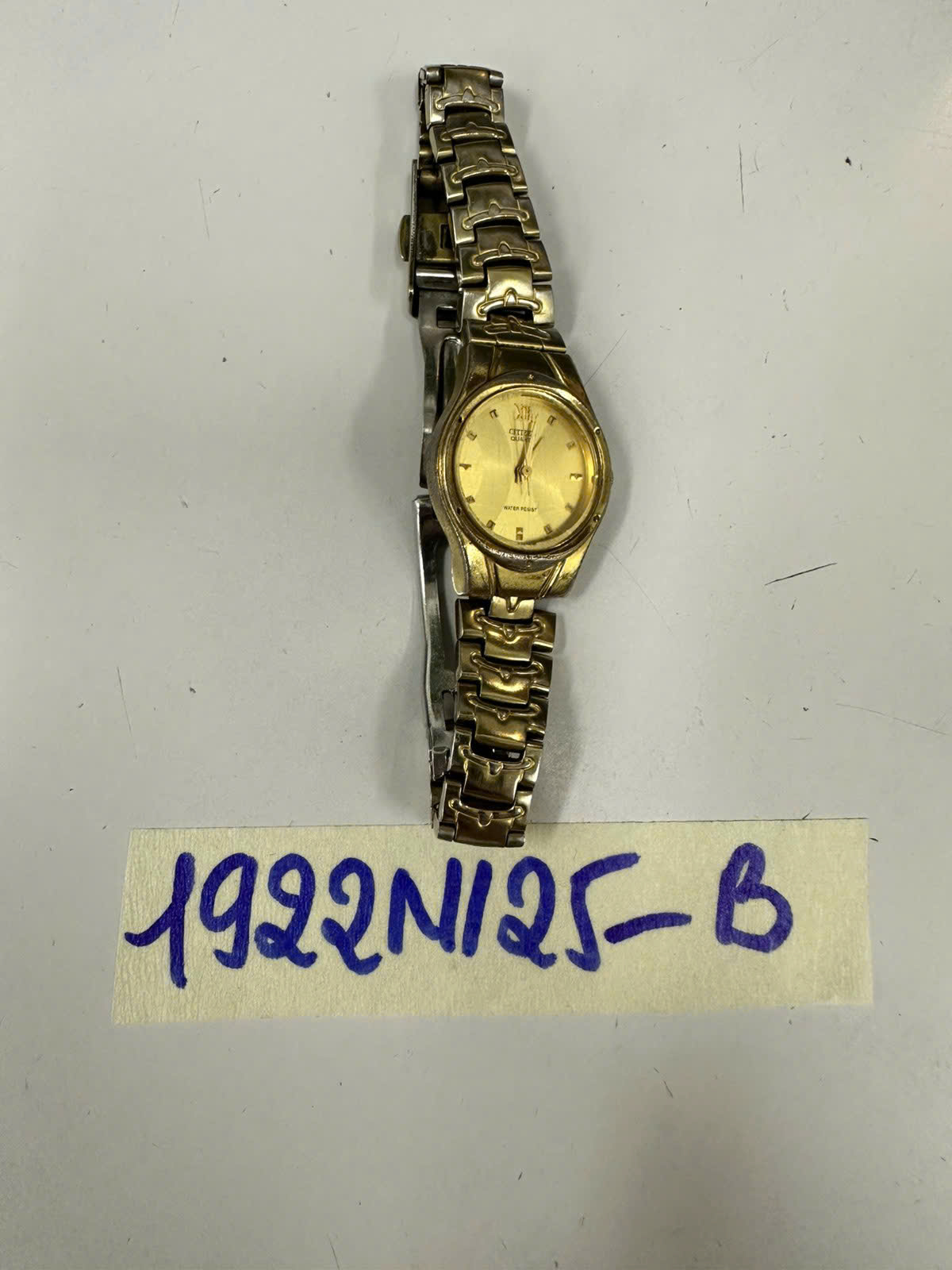Ngày tiếp nhận: 29/10/2025 Mã hồ sơ: 1922N2025B Mô tả: 01 đồng hồ kim loại mặt tròn màu vàng có chữ CITIZEN. |