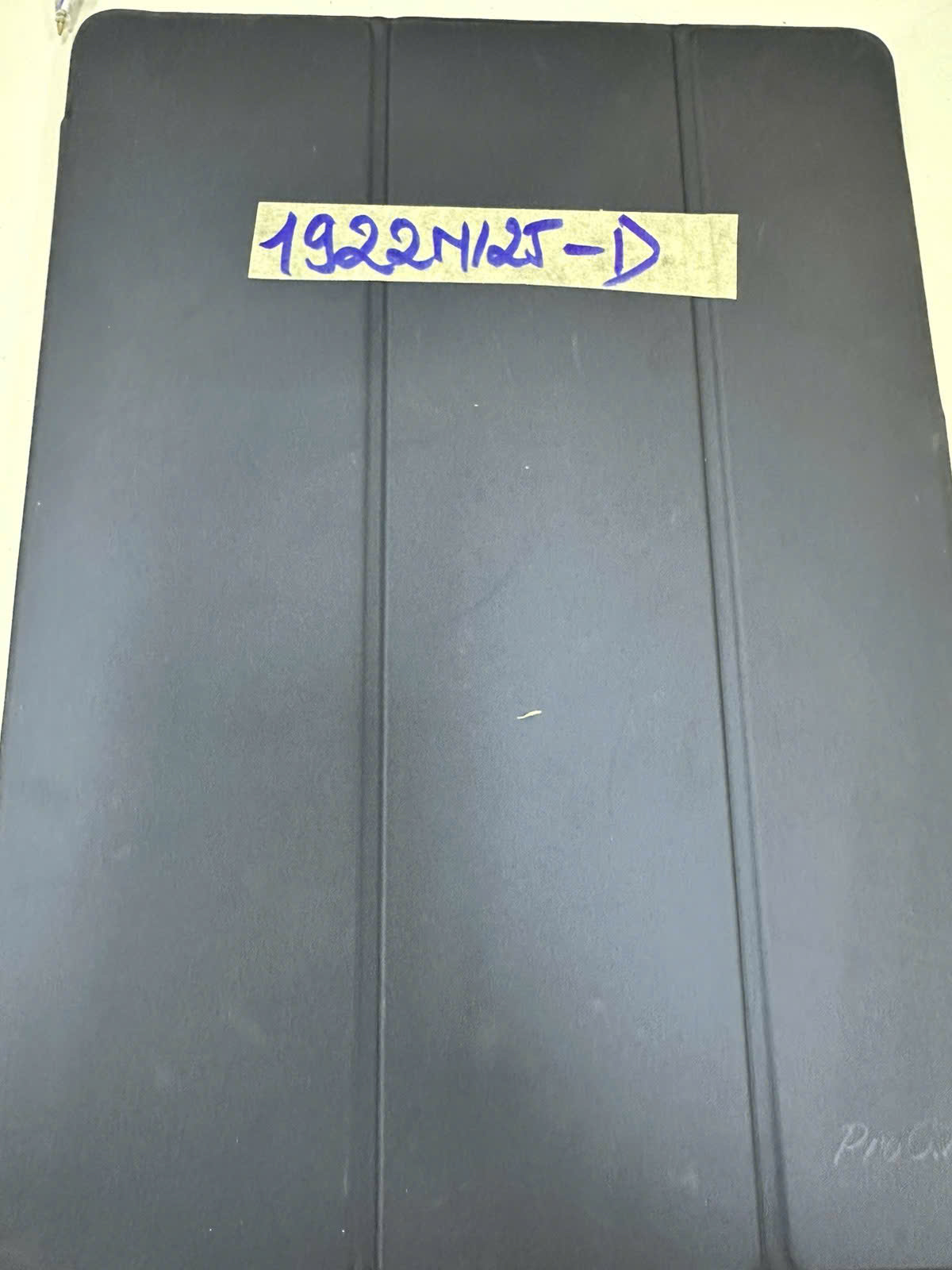 Ngày tiếp nhận: 29/10/2025 Mã hồ sơ: 1922N2025D Mô tả: 01 máy tính bảng màu bạc có chữ IPAD, ốp nhựa màu xanh dương. |