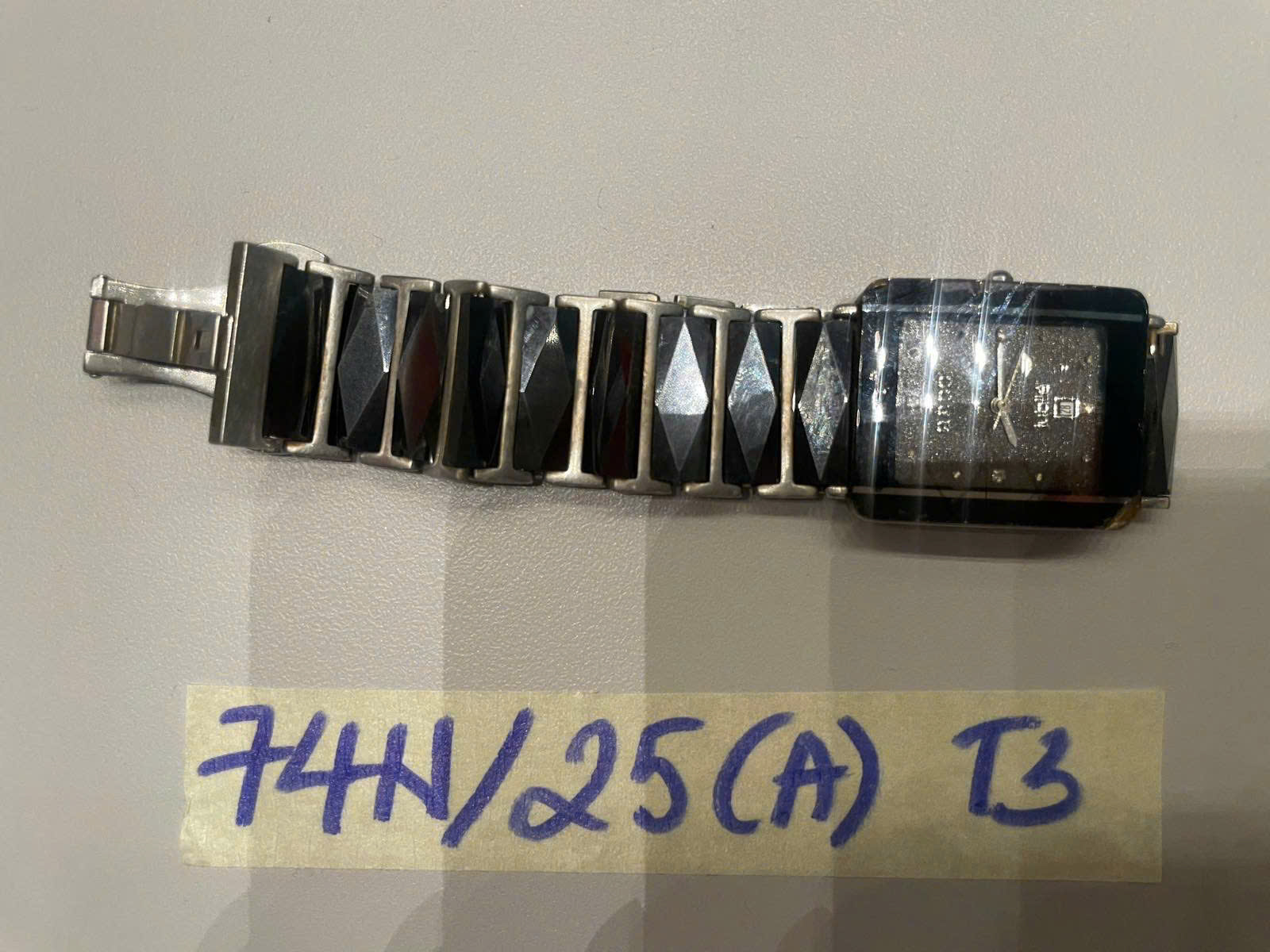 Ngày tiếp nhận: 28/10/2025 Mã hồ sơ: 74N2025A Mô tả: 01 đồng hồ màu đen viền bạc mặt vuông ,có chữ RADO đã qua sử dụng. |