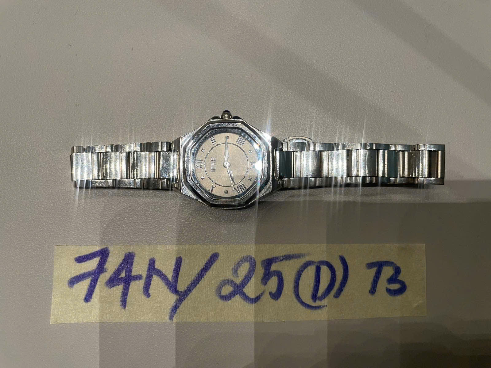 Ngày tiếp nhận: 28/10/2025 Mã hồ sơ: 74N2025D Mô tả: 01 đồng hồ kim loại màu bạc có chữ IEKE. |