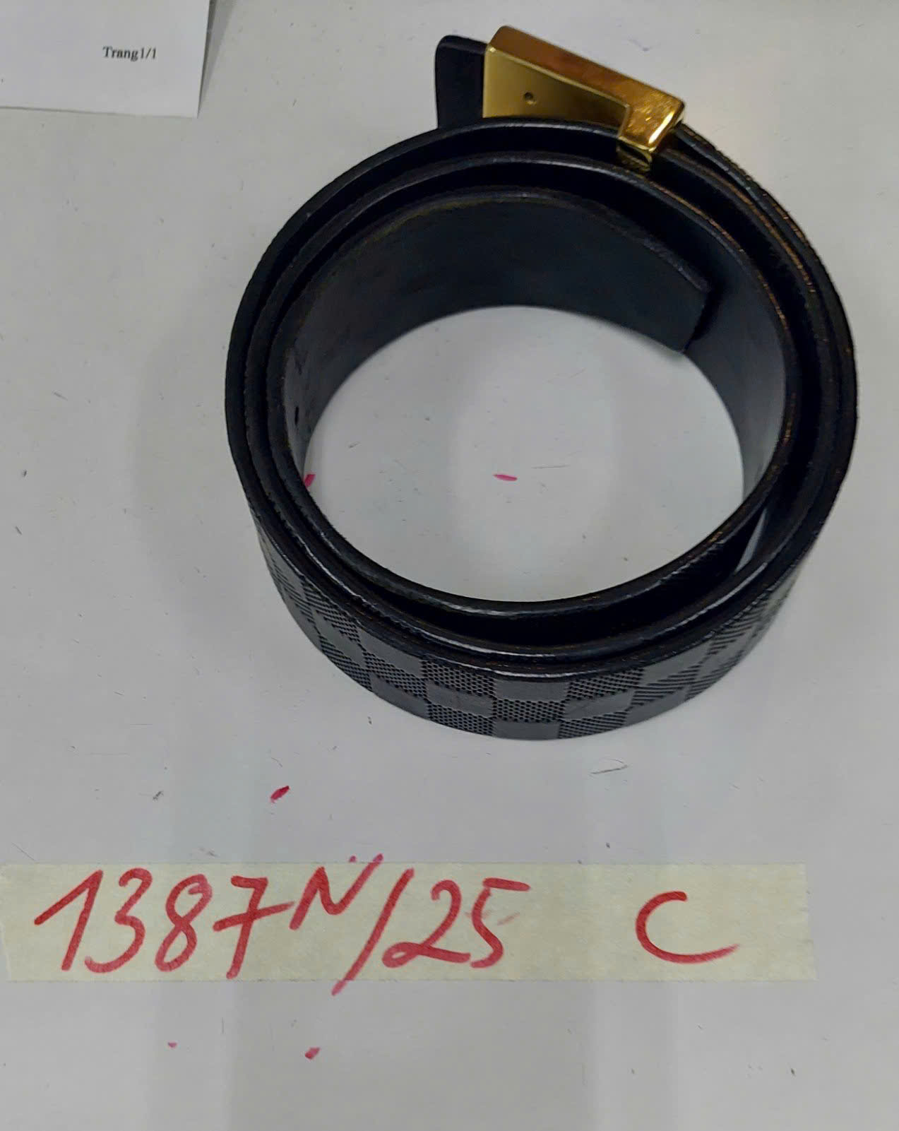 Ngày tiếp nhận: 28/7/2025 Mã hồ sơ: 1387N2025C Mô tả: 01 thắt lưng da màu đen có hoa văn caro ô vuông, khóa thắt lưng bằng kim loại màu vàng đồng có chữ "LV". |