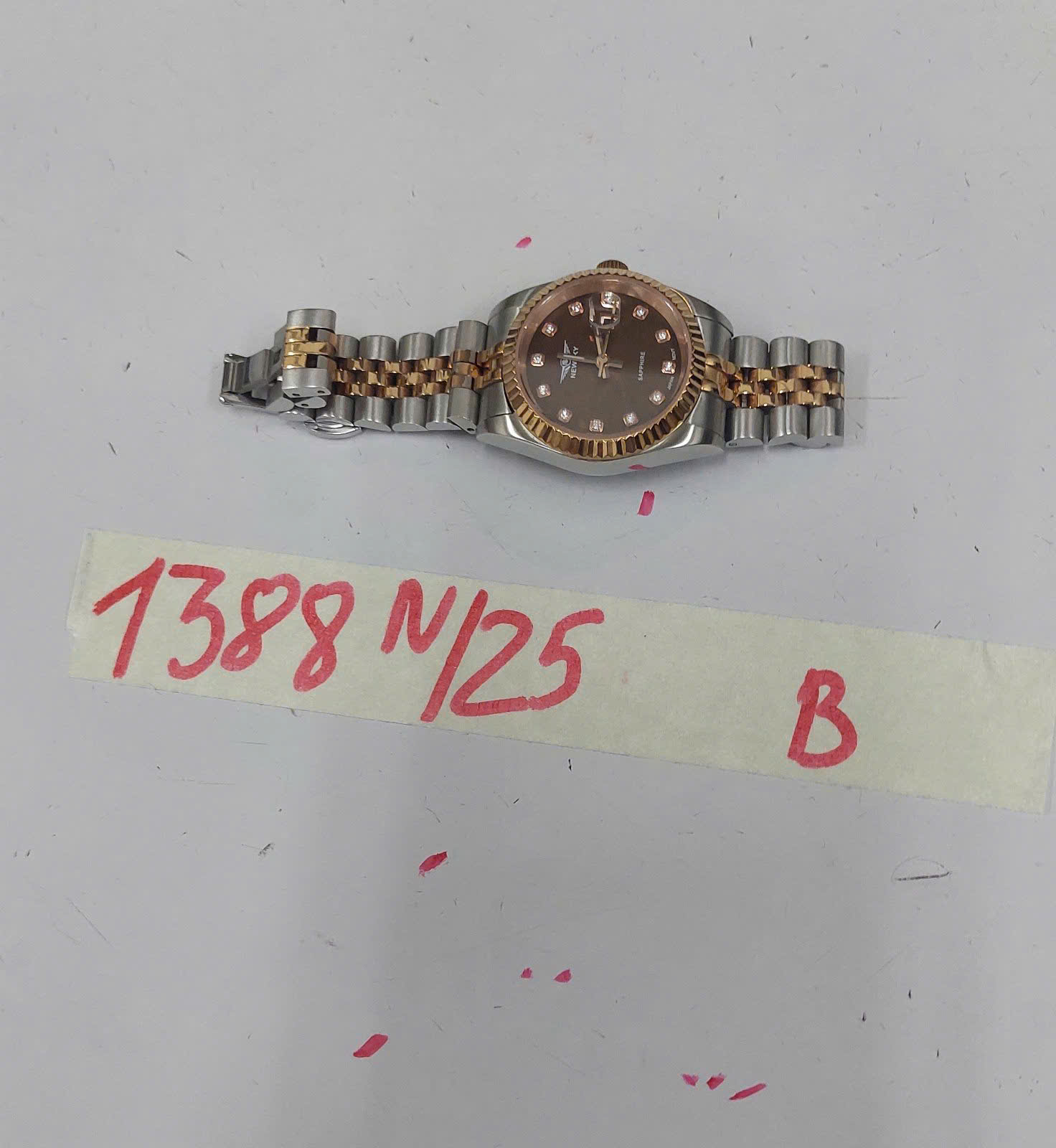 Ngày tiếp nhận: 28/7/2025 Mã hồ sơ: 1388N2025B Mô tả: 01 đồng hồ kim loại màu trắng viên vàng, mặt hình tròn có logo chữ "NEWSKY". |