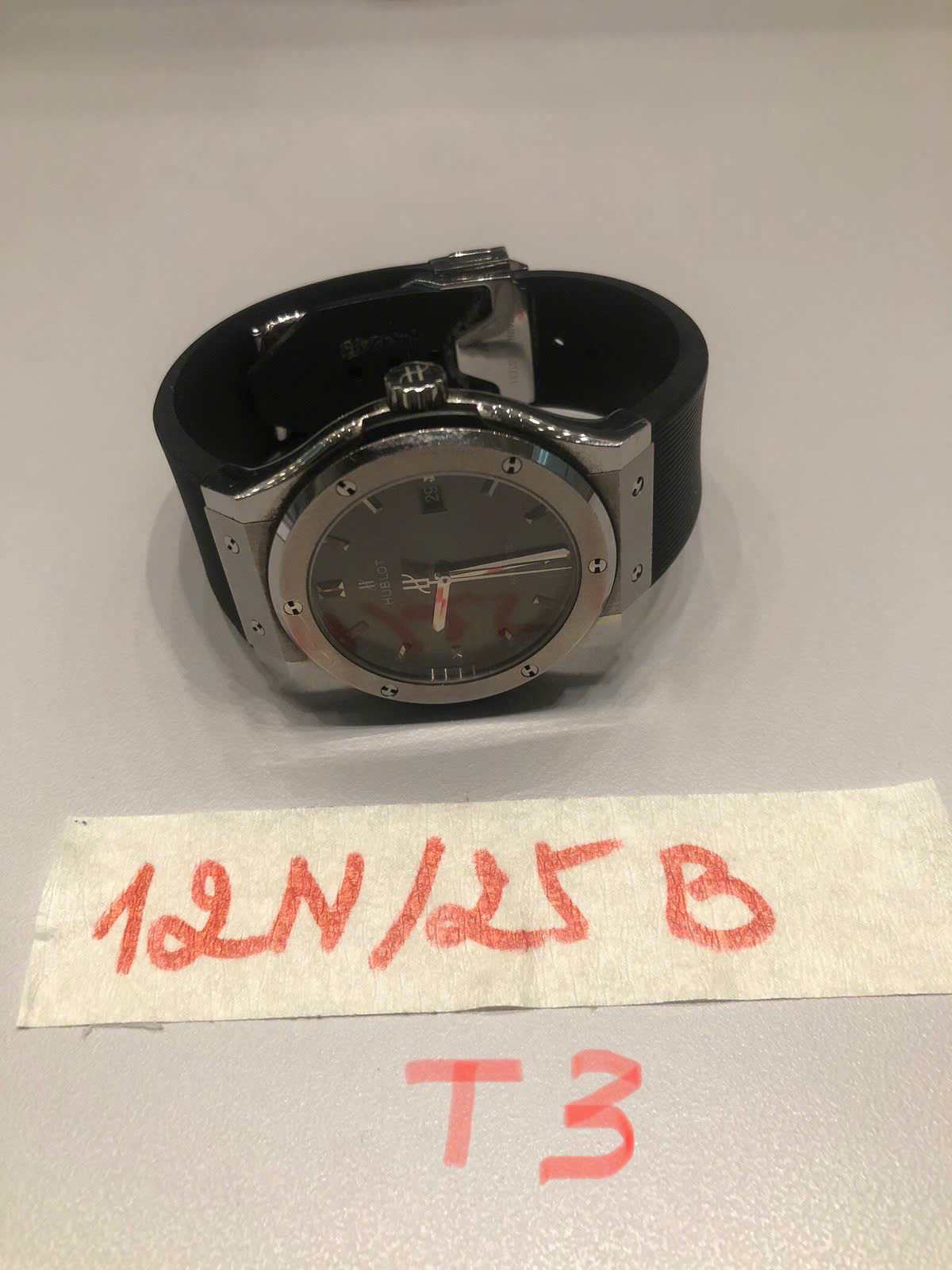 Ngày tiếp nhận: 29/8/2025 Mã hồ sơ: 12N2025B Mô tả: 01 đồng hồ màu bạc dây cao su có chữ HUBLOT. |