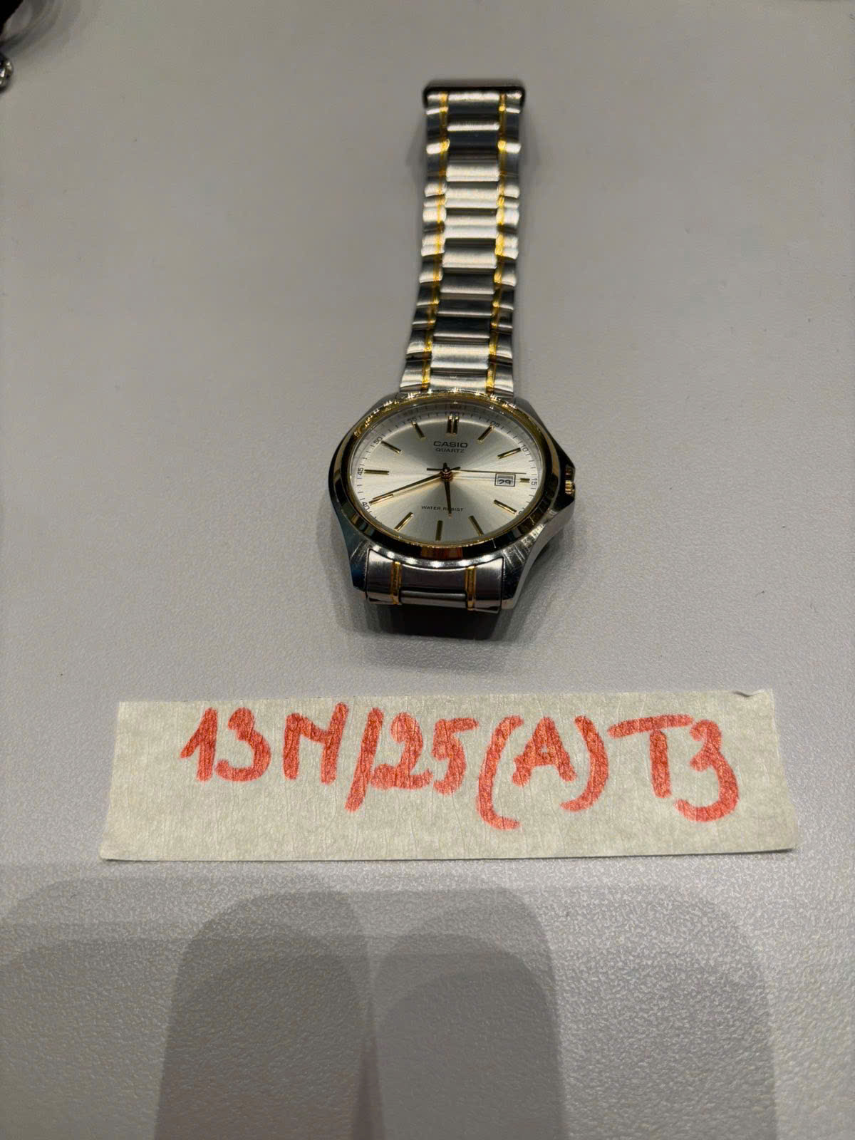 Ngày tiếp nhận: 30/8/2025 Mã hồ sơ: 13N2025A Mô tả: 01 đồng hồ màu bạc, viền vàng có chữ "CASIO". |