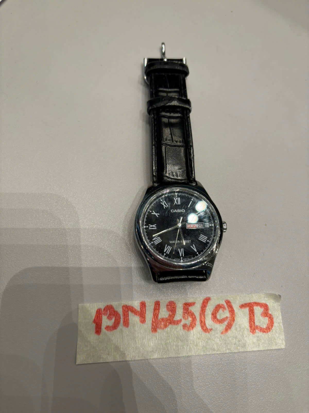 Ngày tiếp nhận: 30/8/2025 Mã hồ sơ: 13N2025C Mô tả: 01 đồng hồ dây da màu đen, mặt tròn màu trắng có chữ "CASIO". |