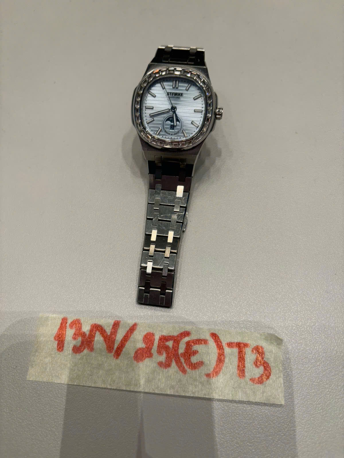 Ngày tiếp nhận: 30/8/2025 Mã hồ sơ: 13N2025E Mô tả: 01 đồng hồ kim loại màu trắng có chữ "STARKE". |