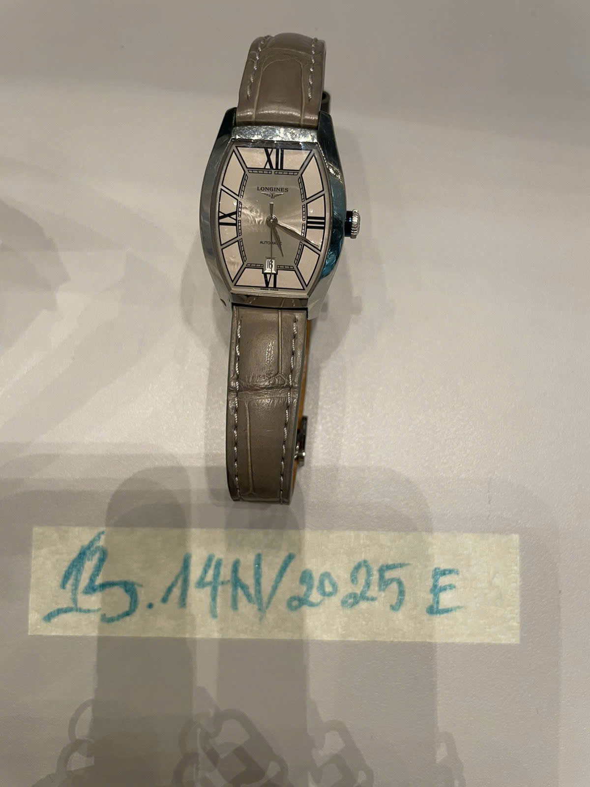 Ngày tiếp nhận: 31/8/2025 Mã hồ sơ: 14N2025E Mô tả: 01 đồng hồ nữ mặt trắng hình Oval có chữ Longiness dây da màu xám. |