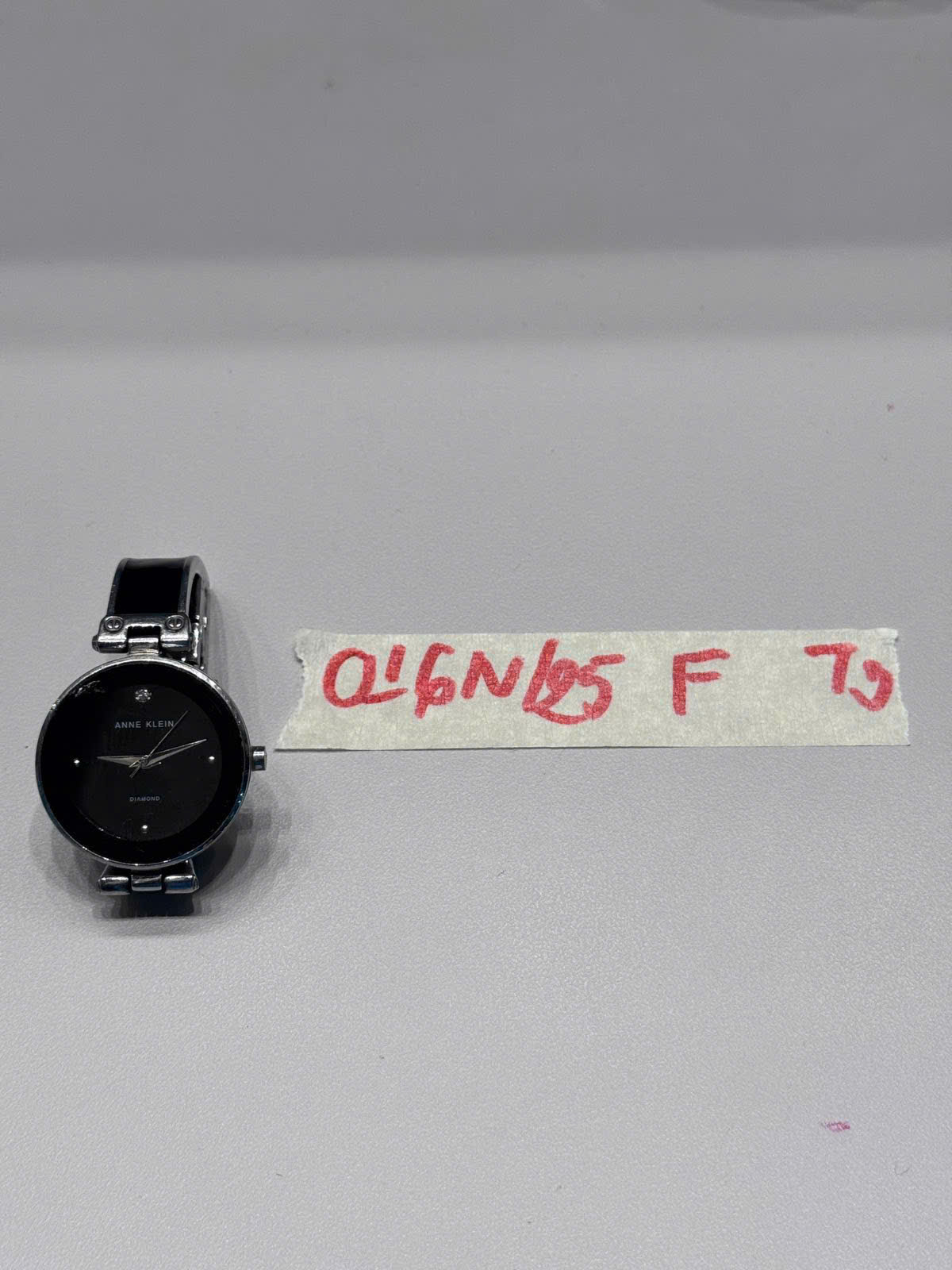 Ngày tiếp nhận: 02/9/2025 Mã hồ sơ: 16N2025F Mô tả: 01 đồng hồ kim loại màu đen có chữ "ANNE KLEIN" đã qua sử dụng. |