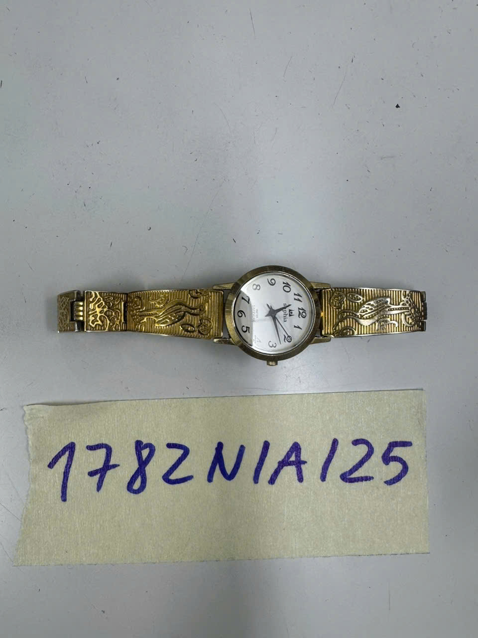 Ngày tiếp nhận: 30/9/2025 Mã hồ sơ: 1782N2025A Mô tả: 01 đồng hồ bằng kim loại màu vàng, mặt đồng hồ hình tròn màu trắng có logo chữ "Sophia". |