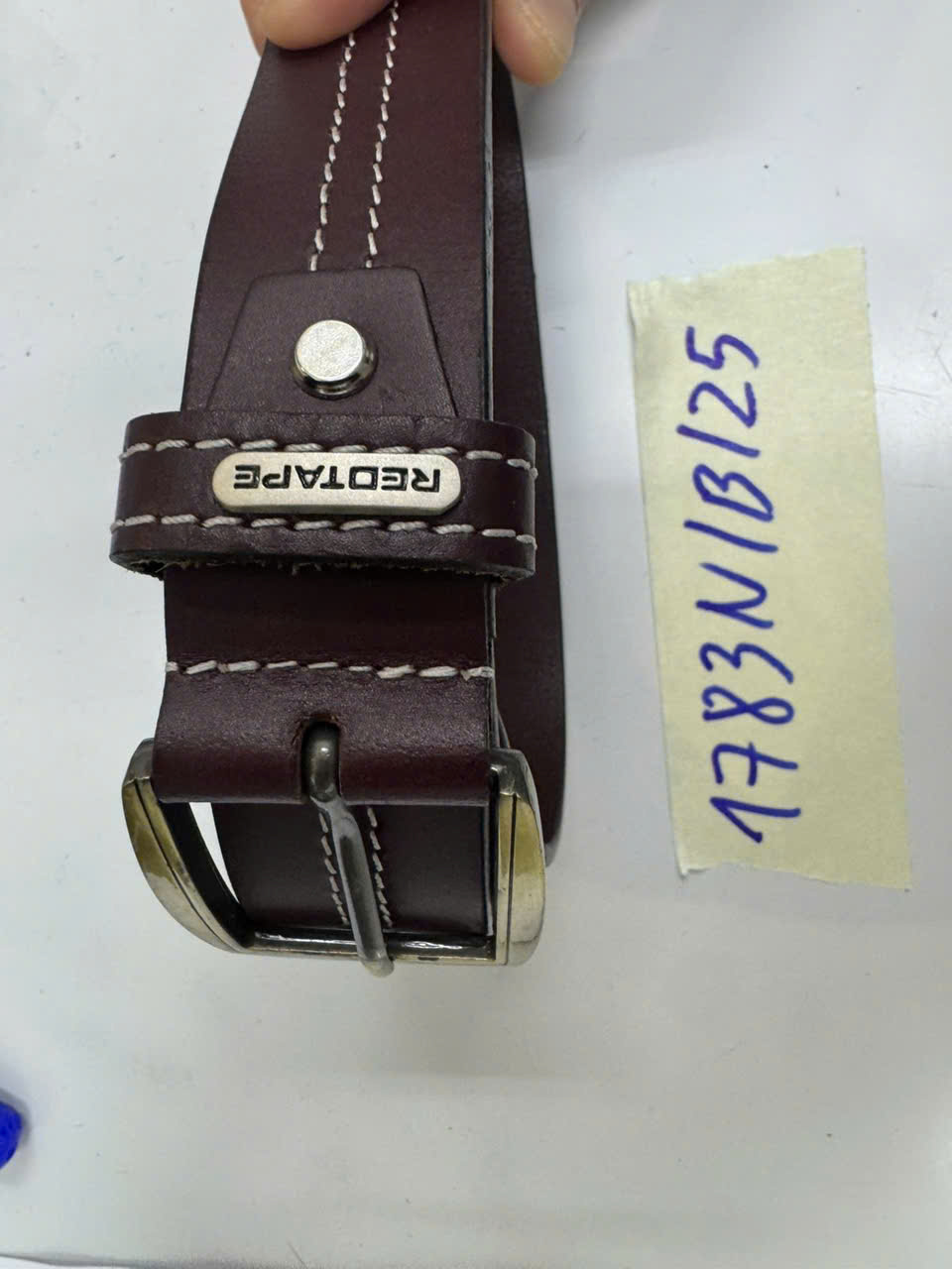 Ngày tiếp nhận: 30/9/2025 Mã hồ sơ: 1783N2025B Mô tả: 01 dây lưng da màu đỏ có khắc dòng chữ REOTAPE. |