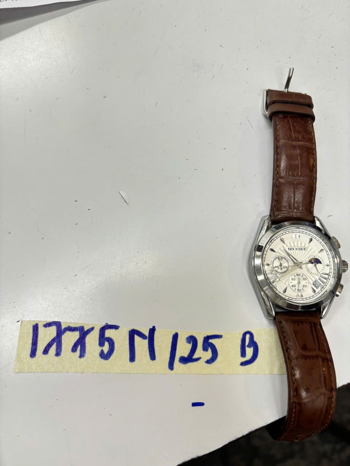 Ngày tiếp nhận: 29/9/2025 Mã hồ sơ: 1775N2025B Mô tả: 01 đồng hồ bằng kim loại màu bạc có chữ "MXXSEE" kèm dây da màu nâu. |