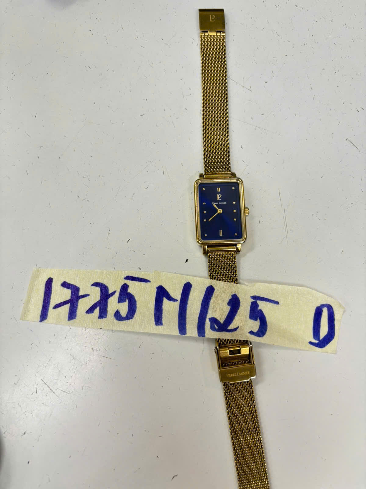 Ngày tiếp nhận: 29/9/2025 Mã hồ sơ: 1775N2025D Mô tả: 01 đồng hồ bằng kim loại màu vàng có chữ "PIERRE LANNIER" kèm dây kim loại màu vàng . |