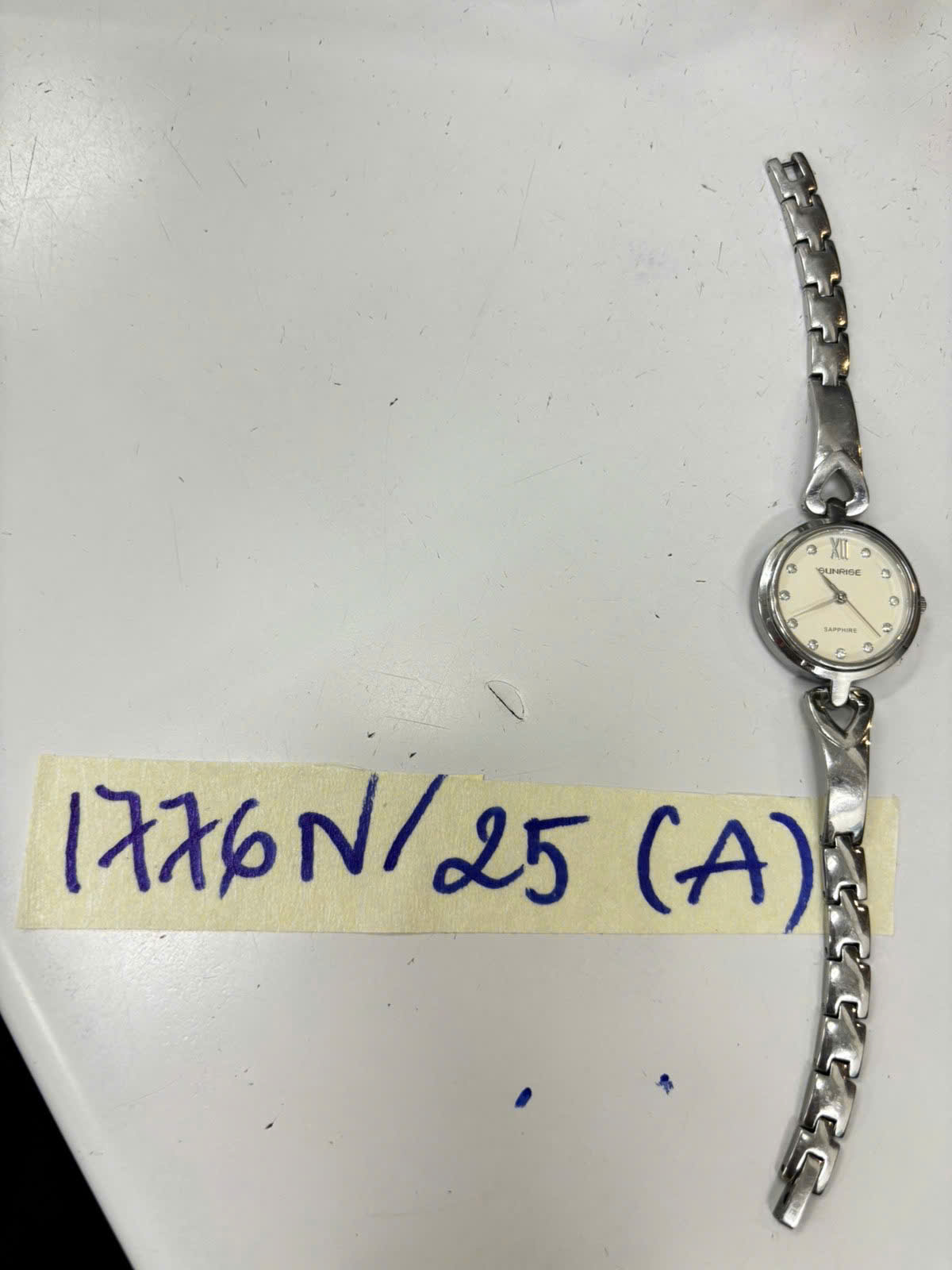 Ngày tiếp nhận: 29/9/2025 Mã hồ sơ: 1776N2025A Mô tả: 01 đồng hồ "SUNRISE" mặt tròn dây kim loại màu bạc. |
