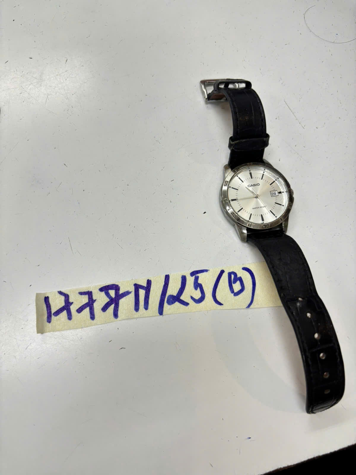 Ngày tiếp nhận: 29/9/2025 Mã hồ sơ: 1777N2025B Mô tả: 01 đồng hồ kim màu xám, dây đeo màu đen, trên đồng hồ có chữ CASIO. |