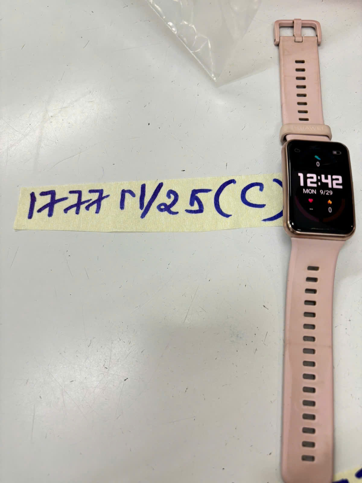 Ngày tiếp nhận: 29/9/2025 Mã hồ sơ: 1777N2025C Mô tả: 01 đồng hồ thông minh, dây đeo cao su màu hồng, trên đồng hồ có chữ HUAWEI. |