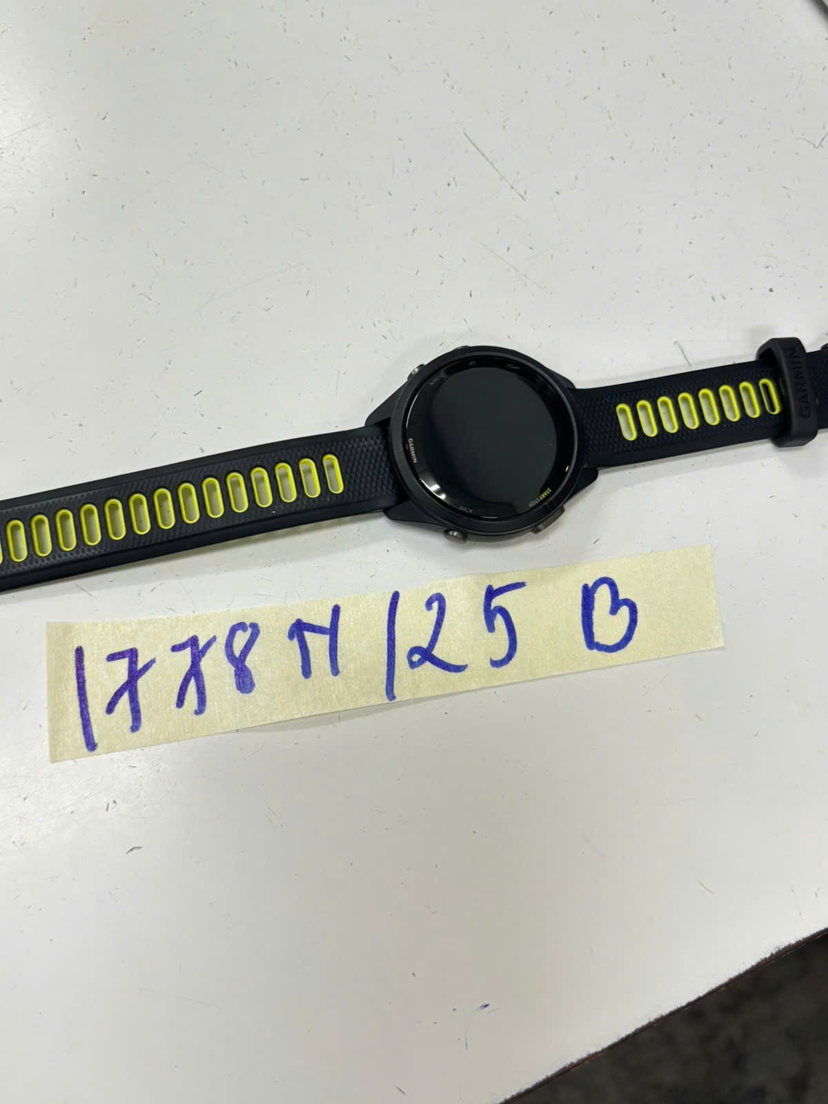 Ngày tiếp nhận: 29/9/2025 Mã hồ sơ: 1778N2025B Mô tả: 01 đồng hồ thông minh mặt tròn màu đen có chữ "Garmin Forerunner 265s", dây cao su màu đen vàng. |