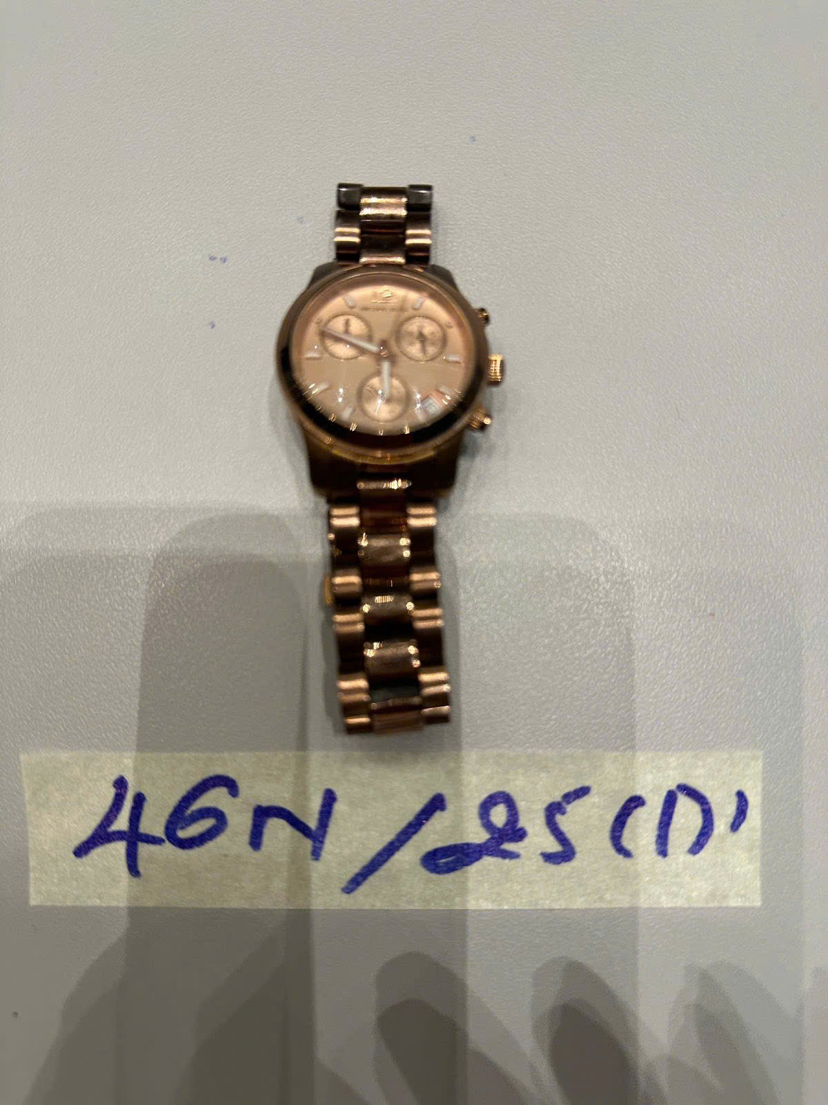 Ngày tiếp nhận: 29/9/2025 Mã hồ sơ: 46N2025D Mô tả: 01 đồng hồ kim loại màu vàng mặt tròn "MICHAEL KORS". |