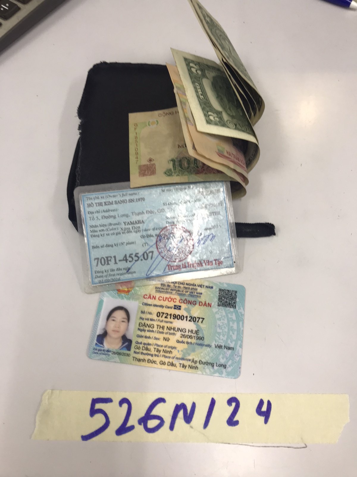 Ngày tiếp nhận: 31/03/2024 có 01 CCCD tên Đặng Thị Nhung Huệ, 01 giấy đăng ký xe tên Hồ Thị Kim Sang, 06USD, 410.000vnđ. |
