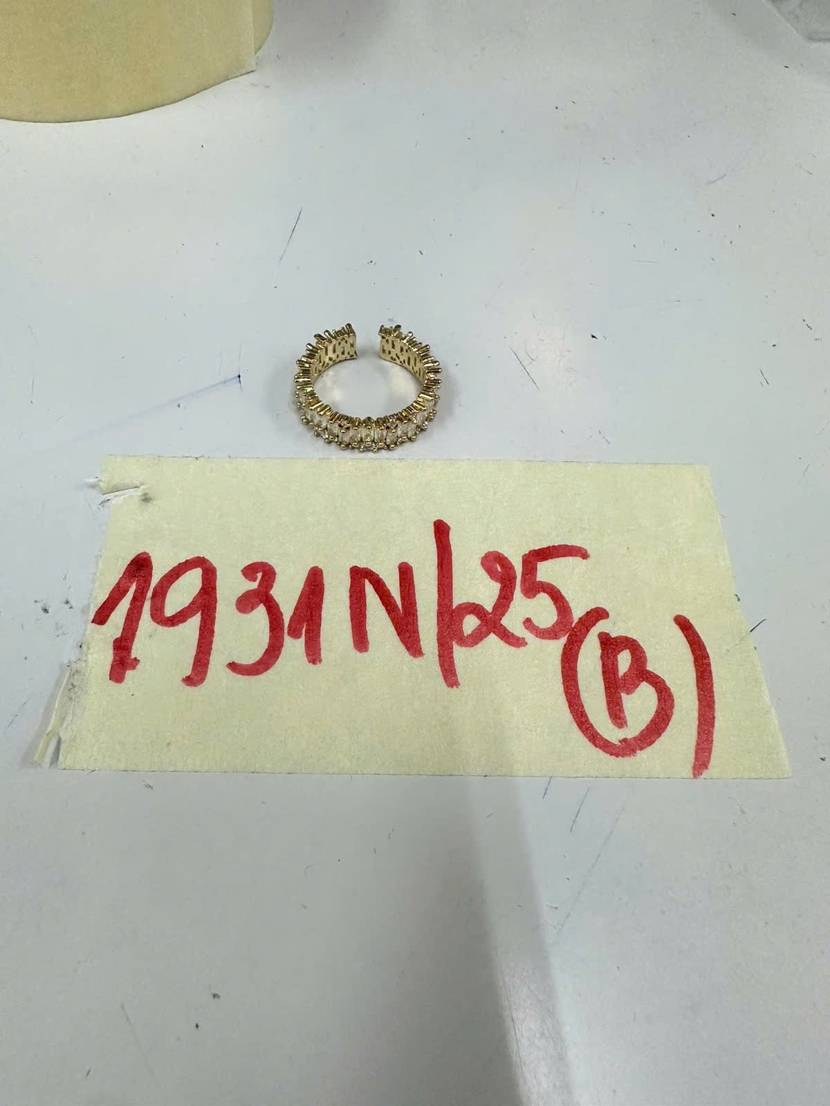 Ngày tiếp nhận: 31/10/2025 Mã hồ sơ: 1931N2025B Mô tả: 01 nhẫn kim loại màu vàng dính nhiều đá trắng. |