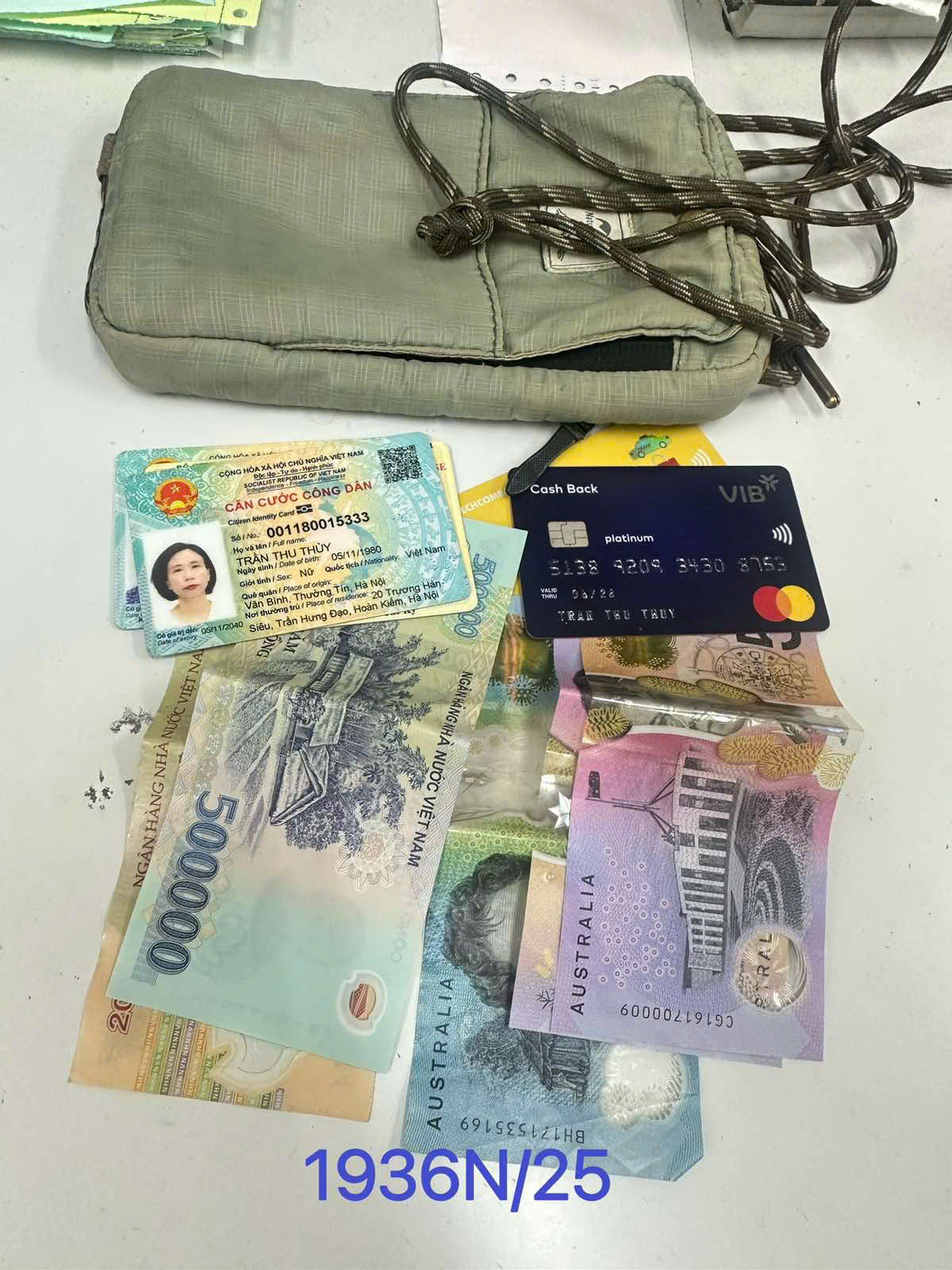 Ngày tiếp nhận: 31/10/2025 Mã hồ sơ: 1936N2025 Mô tả: 01 túi đen vải xám có: 01 căn cước công dân +1 giấy phép lái xe; 02 thẻ ngân hàng tên TRẦN THU THỦY và 01 CCCD mang tên TRẦN ĐỨC TUYẾTvà 20đô la ÚC và 700.000vnd. |