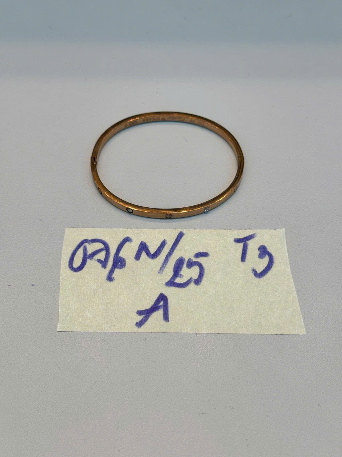 Ngày tiếp nhận: 31/10/2025 Mã hồ sơ: 76N2025A Mô tả: 01 vòng kim loại màu vàng có dính đá màu trắng có chữ 750.19 cartier. |