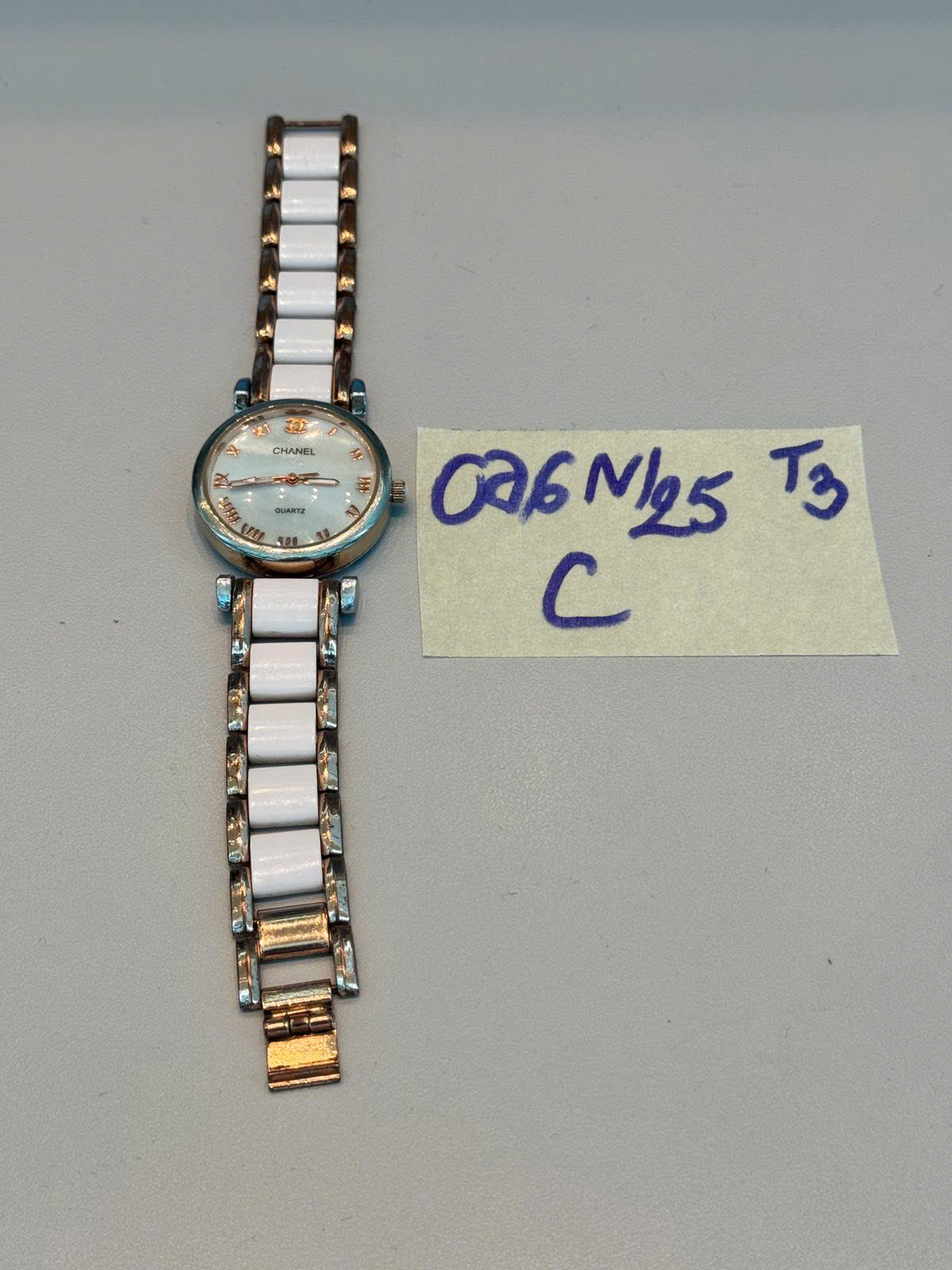 Ngày tiếp nhận: 31/10/2025 Mã hồ sơ: 76N2025C Mô tả: 01 đồng hồ có chữ CHANEL dây trắng viền kim loại. |