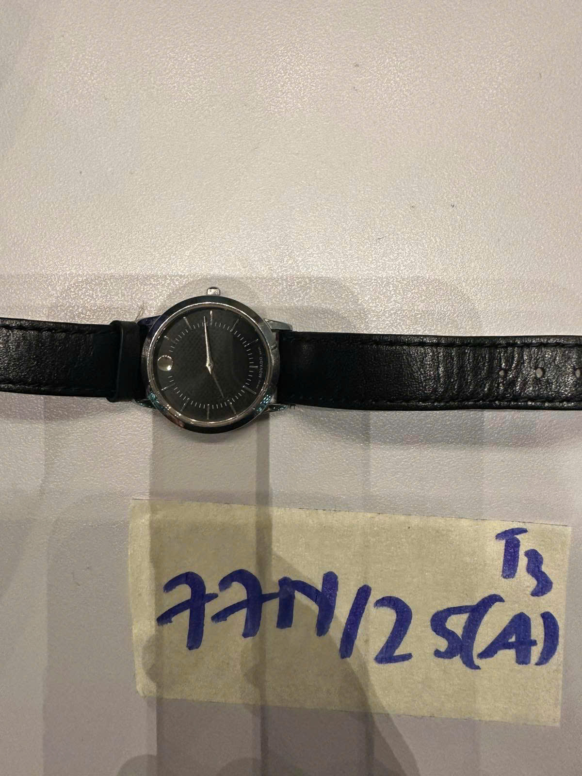Ngày tiếp nhận: 03/11/2025 Mã hồ sơ: 77N2025A Mô tả: 01 đồng hồ da màu đen mặt tròn bên trong có chữ Movado. |