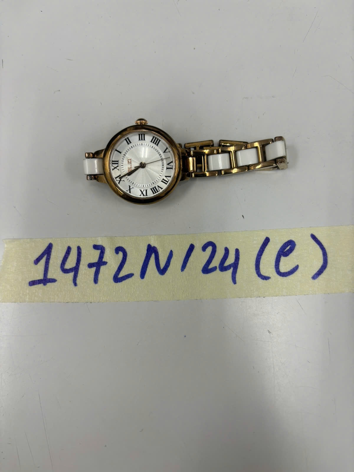 Ngày tiếp nhận: 31/8/2024 Mã hồ sơ: 1472N2024C Mô tả: 01 đồng hồ dây kim loại màu vàng có khớp nối dây màu trắng, mặt tròn màu trắng có ghi chữ ELIO. |