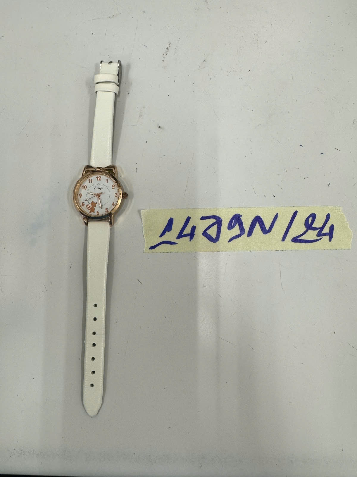 Ngày tiếp nhận: 01/9/2024 Mã hồ sơ: 1479N2024 Mô tả: 01 đồng hồ nhãn hiệu "kasigi" dây da màu trắng, mặt tròn màu vàng trong mặt có hình con mèo. |