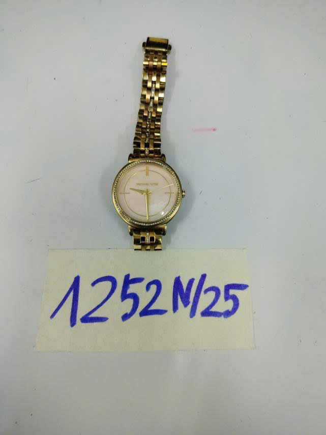 Ngày tiếp nhận: 09/7/2025 Mã hồ sơ: 1252N2025 Mô tả: 01 đồng hồ dây kim loại , mặt kim loại có đính đá xung quanh, có chữ Micheal Kors. |