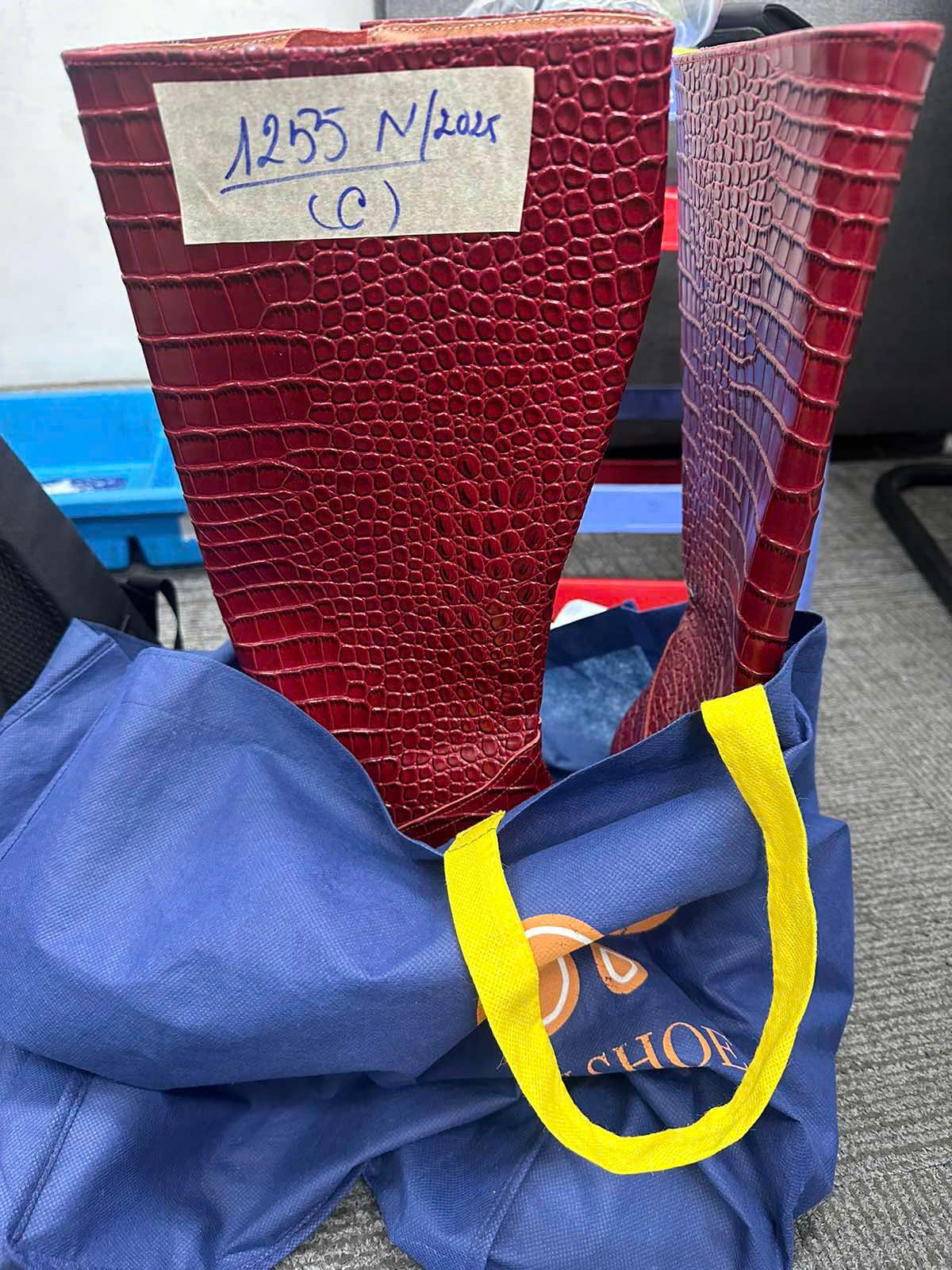 Ngày tiếp nhận: 09/7/2025 Mã hồ sơ: 1255N2025C Mô tả: 01 Túi vải màu xanh dương có chữ ' fiendly shoes shop hoi an ", 01 đôi bốt cao màu đỏ bằng da. |
